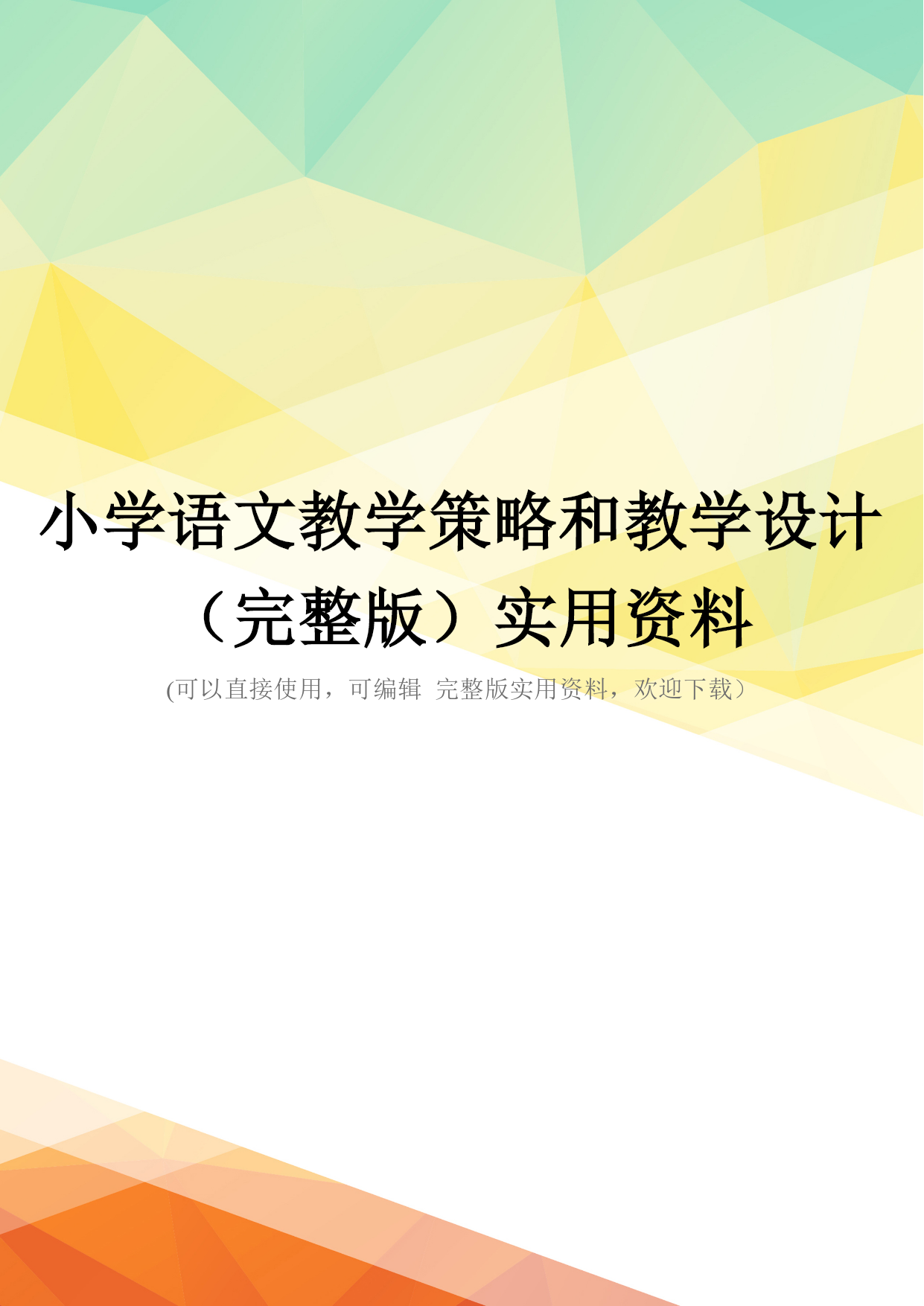 小学语文教学策略和教学设计(完整版)实用资料(可以直接使用,可编辑完整版实用资料,欢迎下载)小学语文教学策略和教学设计第一讲小学语文教学的基本理念学习重点1、全面提高学生的语文素养2、积极倡导自主合作探究的学习方式学习难点语文课程注重跨学科的学习学习方法指导认真阅读资料,写读书笔记。第一讲小学语文教学的基本理念学习内容现代社会要求公民具备良好的人文素养和科学素养,具备创新精神、合作意识和开放的视野,具备包括阅读理解与表达交流在内的多方面的基本能力,以及运用现代技术搜集和处理信息的能力。语文教育应该而且能够