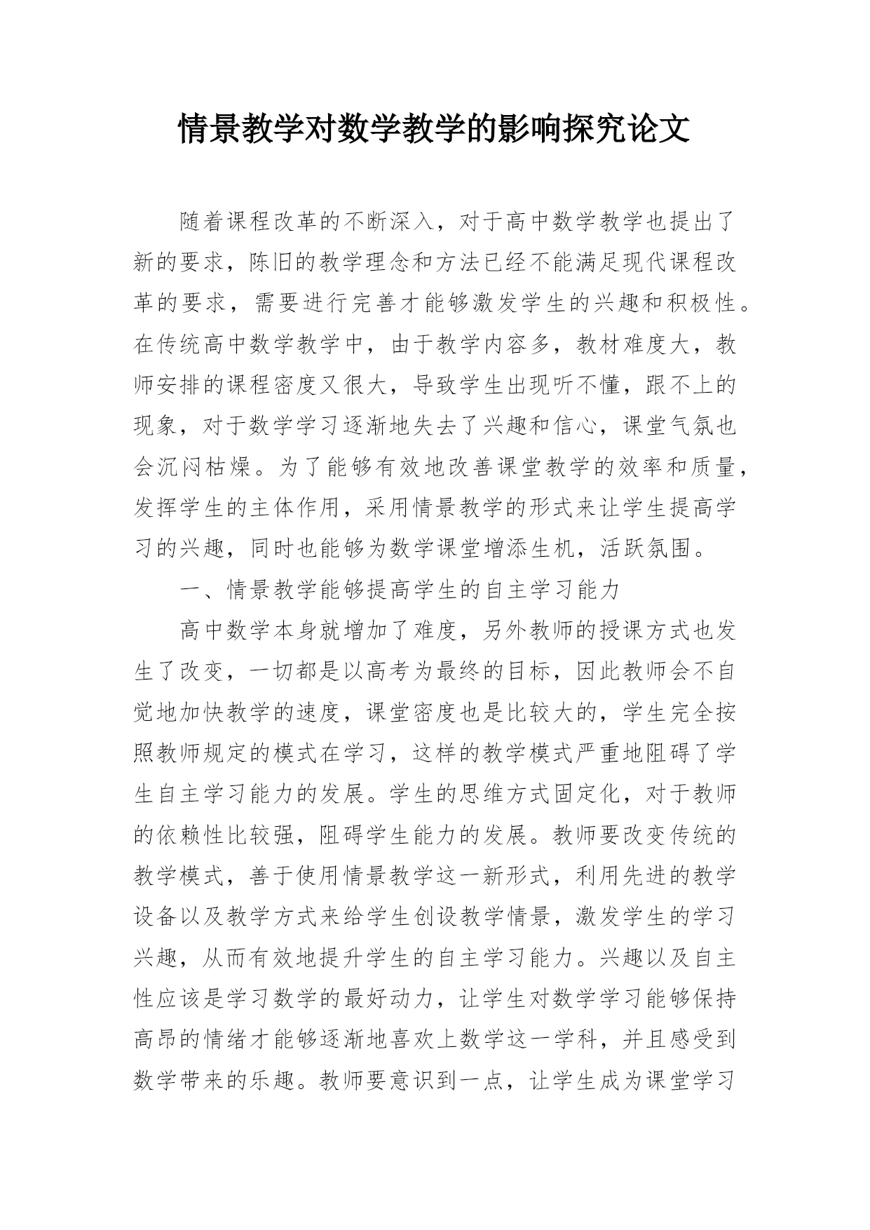 情景教学对数学教学的影响探究论文随着课程改革的不断深入,对于高中数学教学也提出了新的要求,陈旧的教学理念和方法已经不能满足现代课程改革的要求,需要进行完善才能够激发学生的兴趣和积极性。在传统高中数学教学中,由于教学内容多,教材难度大,教师安排的课程密度又很大,导致学生出现听不懂,跟不上的现象,对于数学学习逐渐地失去了兴趣和信心,课堂气氛也会沉闷枯燥。为了能够有效地改善课堂教学的效率和质量,发挥学生的主体作用,采用情景教学的形式来让学生提高学习的兴趣,同时也能够为数学课堂增添生机,活跃氛围。一、情景教学能够