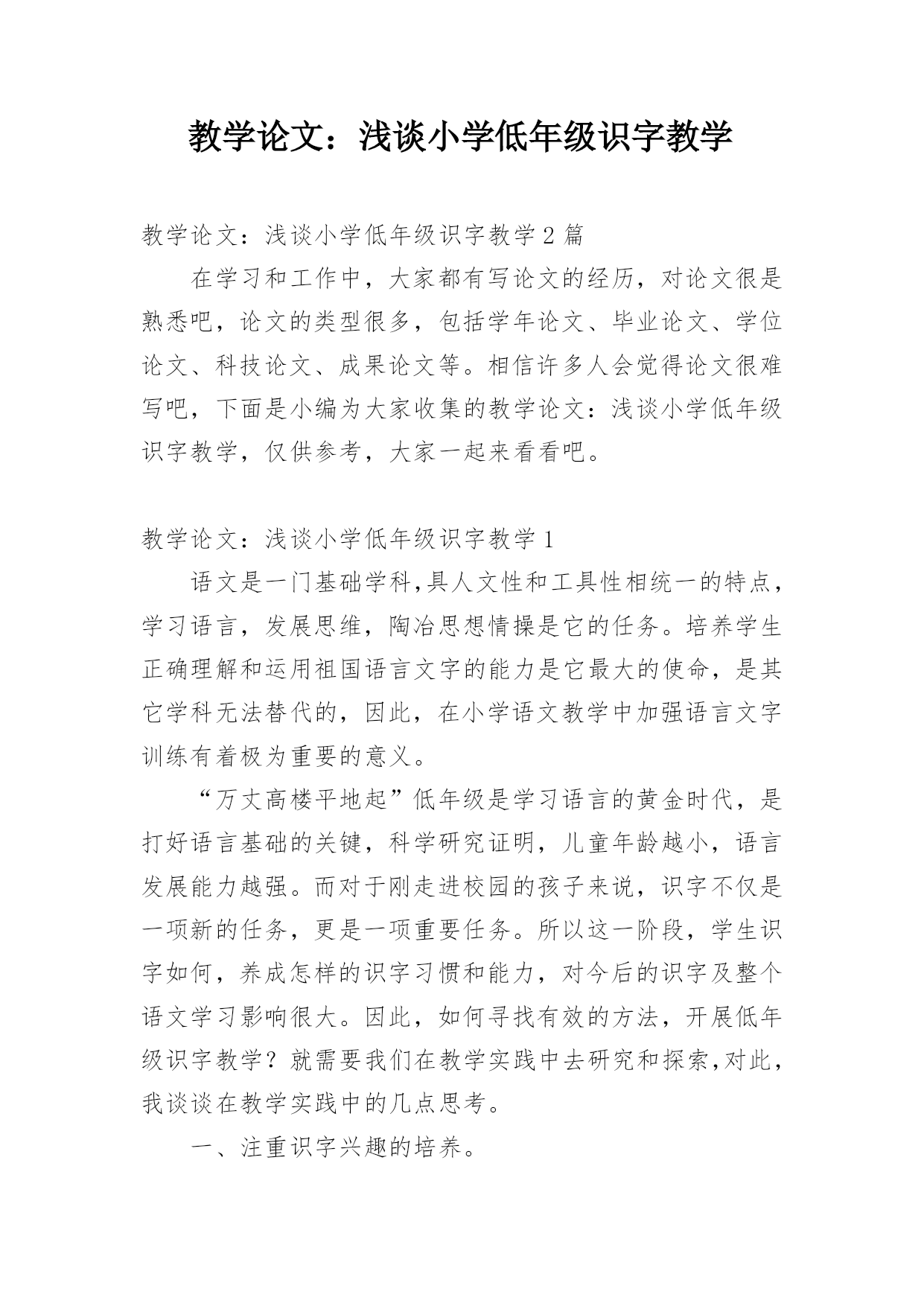 教学论文:浅谈小学低年级识字教学教学论文:浅谈小学低年级识字教学2篇在学习和工作中,大家都有写论文的经历,对论文很是熟悉吧,论文的类型很多,包括学年论文、毕业论文、学位论文、科技论文、成果论文等。相信许多人会觉得论文很难写吧,下面是小编为大家收集的教学论文:浅谈小学低年级识字教学,仅供参考,大家一起来看看吧。教学论文:浅谈小学低年级识字教学1语文是一门基础学科,具人文性和工具性相统一的特点,学习语言,发展思维,陶冶思想情操是它的任务。培养学生正确理解和运用祖国语言文字的能力是它最大的使命,是其它学科无法替