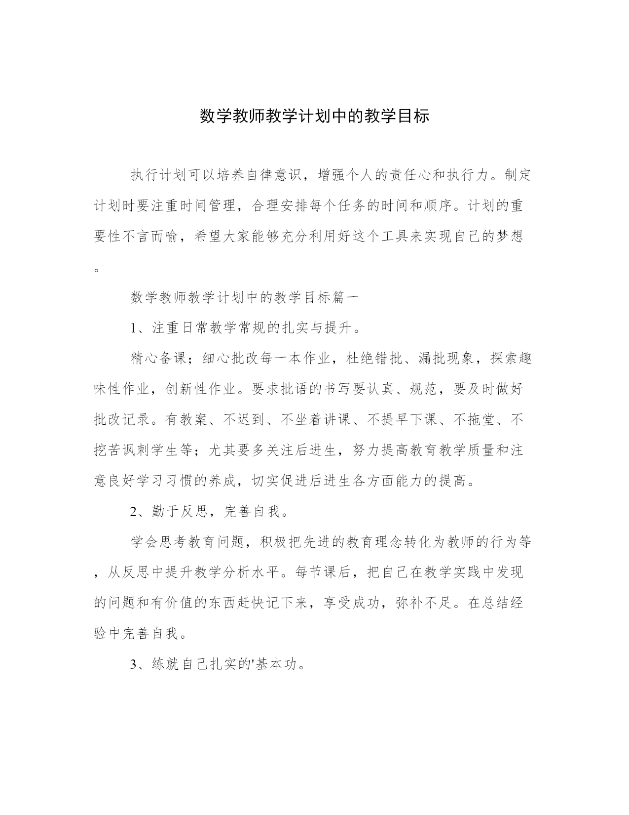 数学教师教学计划中的教学目标执行计划可以培养自律意识,增强个人的责任心和执行力。制定计划时要注重时间管理,合理安排每个任务的时间和顺序。计划的重要性不言而喻,希望大家能够充分利用好这个工具来实现自己的梦想。数学教师教学计划中的教学目标篇一1、注重日常教学常规的扎实与提升。精心备课;细心批改每一本作业,杜绝错批、漏批现象,探索趣味性作业,创新性作业。要求批语的书写要认真、规范,要及时做好批改记录。有教案、不迟到、不坐着讲课、不提早下课、不拖堂、不挖苦讽刺学生等;尤其要多关注后进生,努力提高教育教学质量和注意