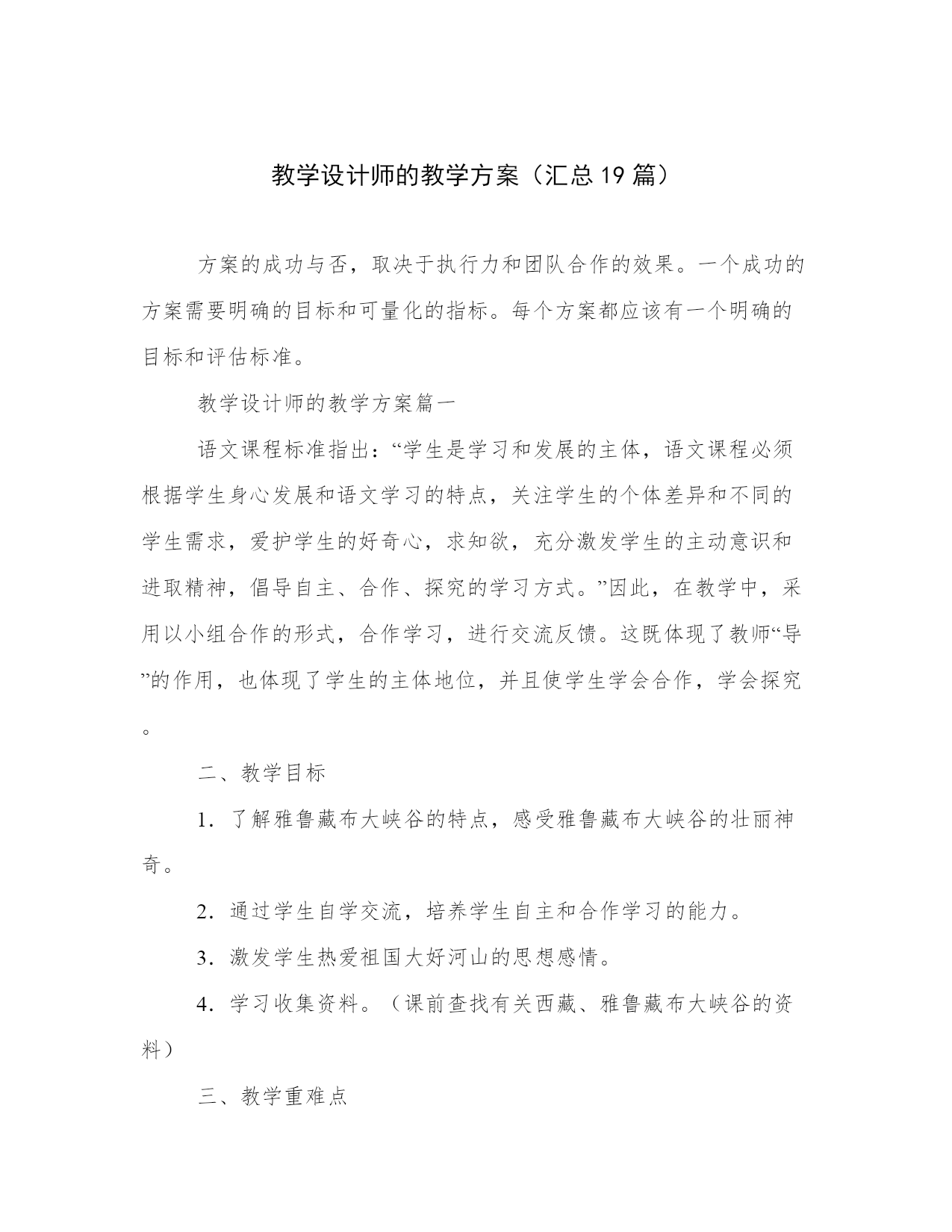 教学设计师的教学方案(汇总19篇)方案的成功与否,取决于执行力和团队合作的效果。一个成功的方案需要明确的目标和可量化的指标。每个方案都应该有一个明确的目标和评估标准。教学设计师的教学方案篇一语文课程标准指出:“学生是学习和发展的主体,语文课程必须根据学生身心发展和语文学习的特点,关注学生的个体差异和不同的学生需求,爱护学生的好奇心,求知欲,充分激发学生的主动意识和进取精神,倡导自主、合作、探究的学习方式。”因此,在教学中,采用以小组合作的形式,合作学习,进行交流反馈。这既体现了教师“导”的作用,也体现了学