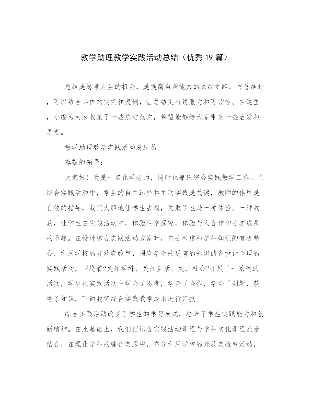 教学助理教学实践活动总结(优秀19篇)总结是思考人生的机会,是提高自身能力的必经之路。写总结时,可以结合具体的实例和案例,让总结更有说服力和可读性。在这里,小编为大家收集了一些总结范文,希望能够给大家带来一些启发和思考。教学助理教学实践活动总结篇一尊敬的领导:大家好!我是一名化学老师,同时也兼任综合实践教学工作。在综合实践活动中,学生的自主选择和主动实践是关键,教师的作用是有效的指导,我们大胆地让学生去闯,失败了也是一种体验、一种收获,让学生在实践活动中,体验科学探究,体验与人合作和分享成果的乐趣。在设计