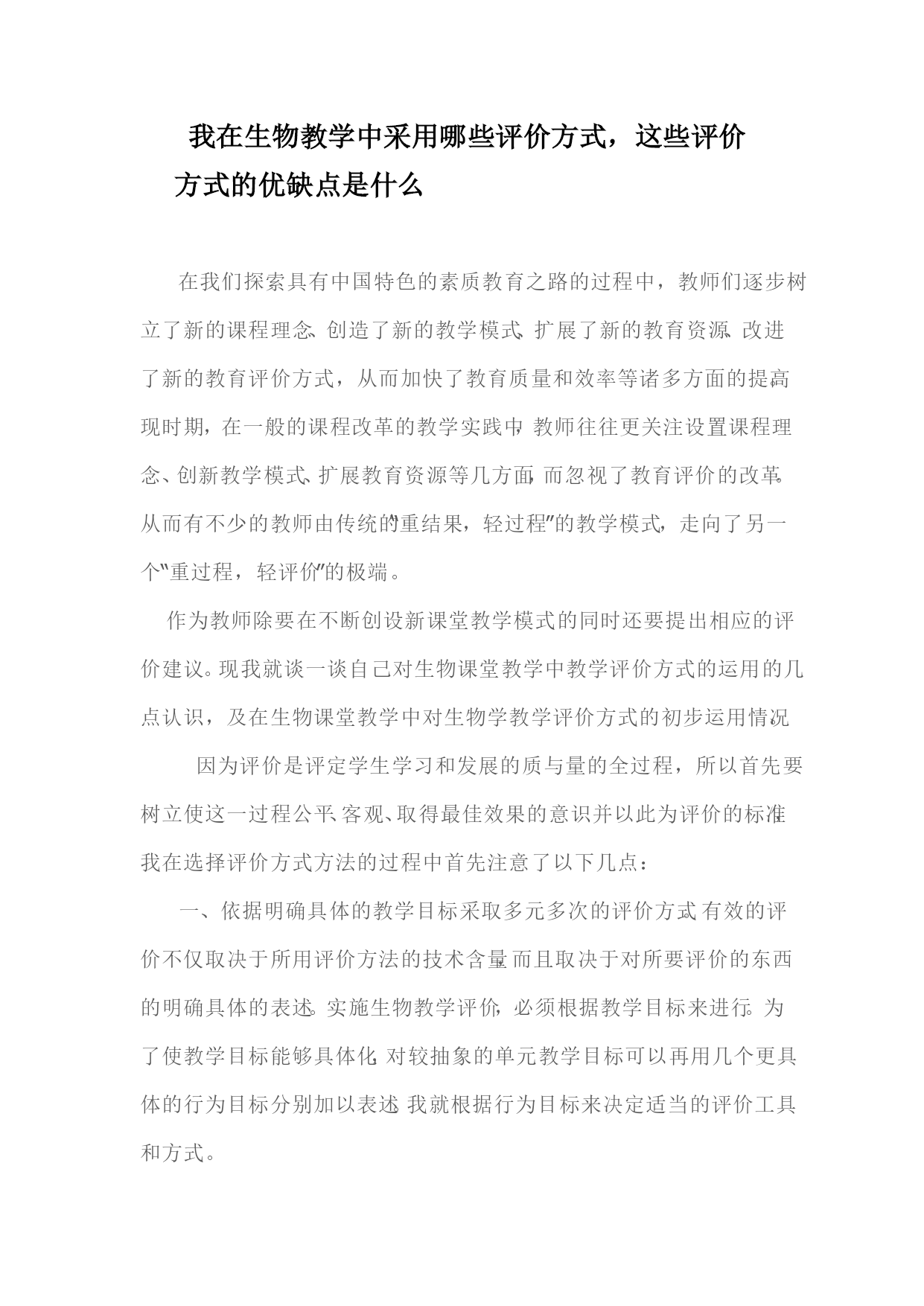 我在生物教学中采用哪些评价方式,这些评价方式的优缺点是什么在我们探索具有中国特色的素质教育之路的过程中,教师们逐步树立了新的课程理念、创造了新的教学模式、扩展了新的教育资源、改进了新的教育评价方式,从而加快了教育质量和效率等诸多方面的提高。现时期,在一般的课程改革的教学实践中,教师往往更关注设置课程理念、创新教学模式、扩展教育资源等几方面,而忽视了教育评价的改革。从而有不少的教师由传统的“重结果,轻过程”的教学模式,走向了另一个“重过程,轻评价”的极端。作为教师除要在不断创设新课堂教学模式的同时还要提出相
