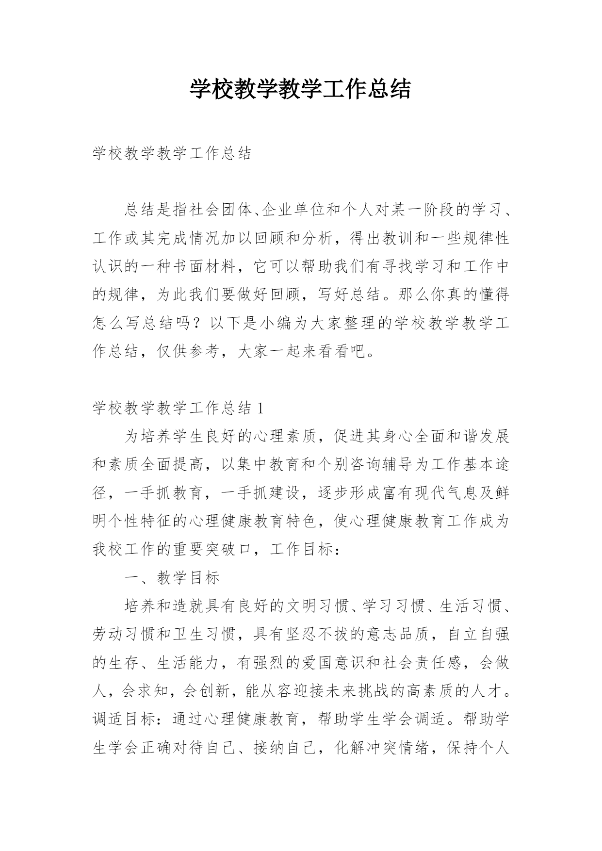 学校教学教学工作总结学校教学教学工作总结总结是指社会团体、企业单位和个人对某一阶段的学习、工作或其完成情况加以回顾和分析,得出教训和一些规律性认识的一种书面材料,它可以帮助我们有寻找学习和工作中的规律,为此我们要做好回顾,写好总结。那么你真的懂得怎么写总结吗?以下是小编为大家整理的学校教学教学工作总结,仅供参考,大家一起来看看吧。学校教学教学工作总结1为培养学生良好的心理素质,促进其身心全面和谐发展和素质全面提高,以集中教育和个别咨询辅导为工作基本途径,一手抓教育,一手抓建设,逐步形成富有现代气息及鲜明个