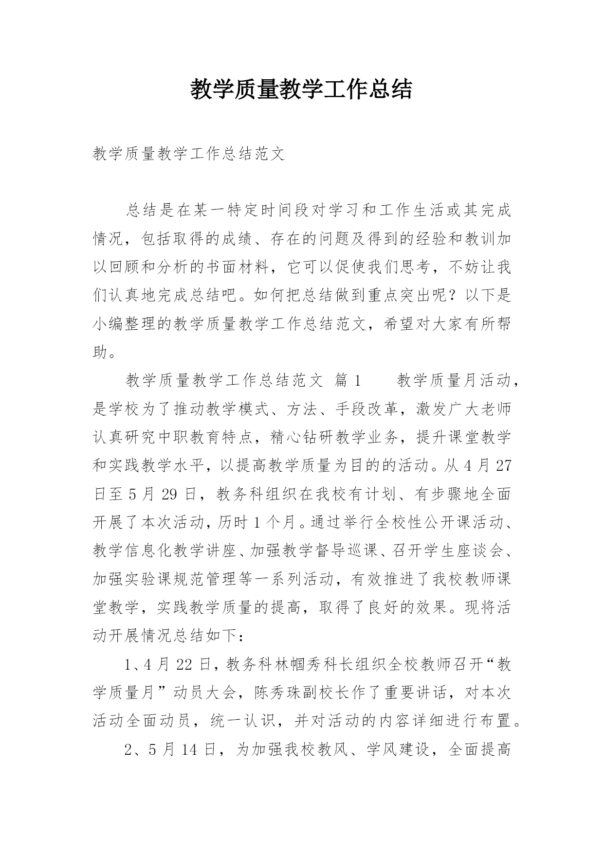 教学质量教学工作总结教学质量教学工作总结范文总结是在某一特定时间段对学习和工作生活或其完成情况,包括取得的成绩、存在的问题及得到的经验和教训加以回顾和分析的书面材料,它可以促使我们思考,不妨让我们认真地完成总结吧。如何把总结做到重点突出呢?以下是小编整理的教学质量教学工作总结范文,希望对大家有所帮助。教学质量教学工作总结范文篇1教学质量月活动,是学校为了推动教学模式、方法、手段改革,激发广大老师认真研究中职教育特点,精心钻研教学业务,提升课堂教学和实践教学水平,以提高教学质量为目的的活动。从4月27日至5