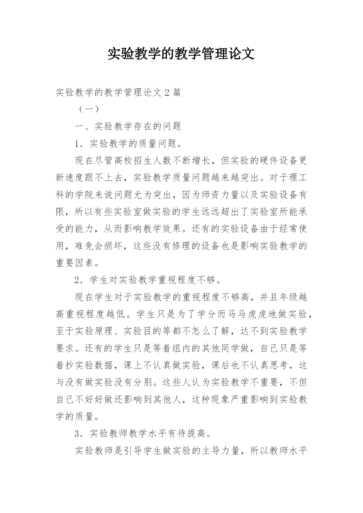实验教学的教学管理论文实验教学的教学管理论文2篇(一)一、实验教学存在的问题1.实验教学的质量问题。现在尽管高校招生人数不断增长,但实验的硬件设备更新速度跟不上去,实验教学质量问题越来越突出。对于理工科的学院来说问题尤为突出,因为师资力量以及实验设备有限,所以有些实验室做实验的学生远远超出了实验室所能承受的能力,从而影响教学效果。还有的实验设备由于经常使用,难免会损坏,这些没有修理的设备也是影响实验教学的重要因素。2.学生对实验教学重视程度不够。现在学生对于实验教学的重视程度不够高,并且年级越高重视程度越