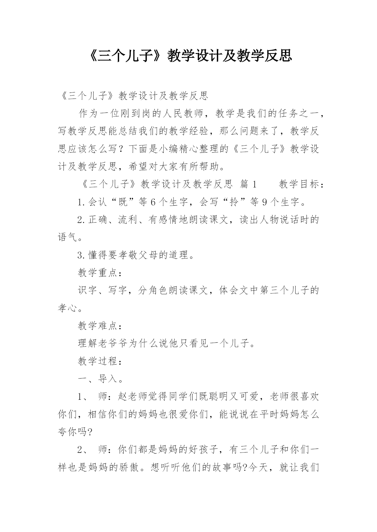《三个儿子》教学设计及教学反思《三个儿子》教学设计及教学反思作为一位刚到岗的人民教师,教学是我们的任务之一,写教学反思能总结我们的教学经验,那么问题来了,教学反思应该怎么写?下面是小编精心整理的《三个儿子》教学设计及教学反思,希望对大家有所帮助。《三个儿子》教学设计及教学反思篇1教学目标:1.会认“既”等6个生字,会写“拎”等9个生字。2.正确、流利、有感情地朗读课文,读出人物说话时的语气。3.懂得要孝敬父母的道理。教学重点:识字、写字,分角色朗读课文,体会文中第三个儿子的孝心。教学难点:理解老爷爷为什么