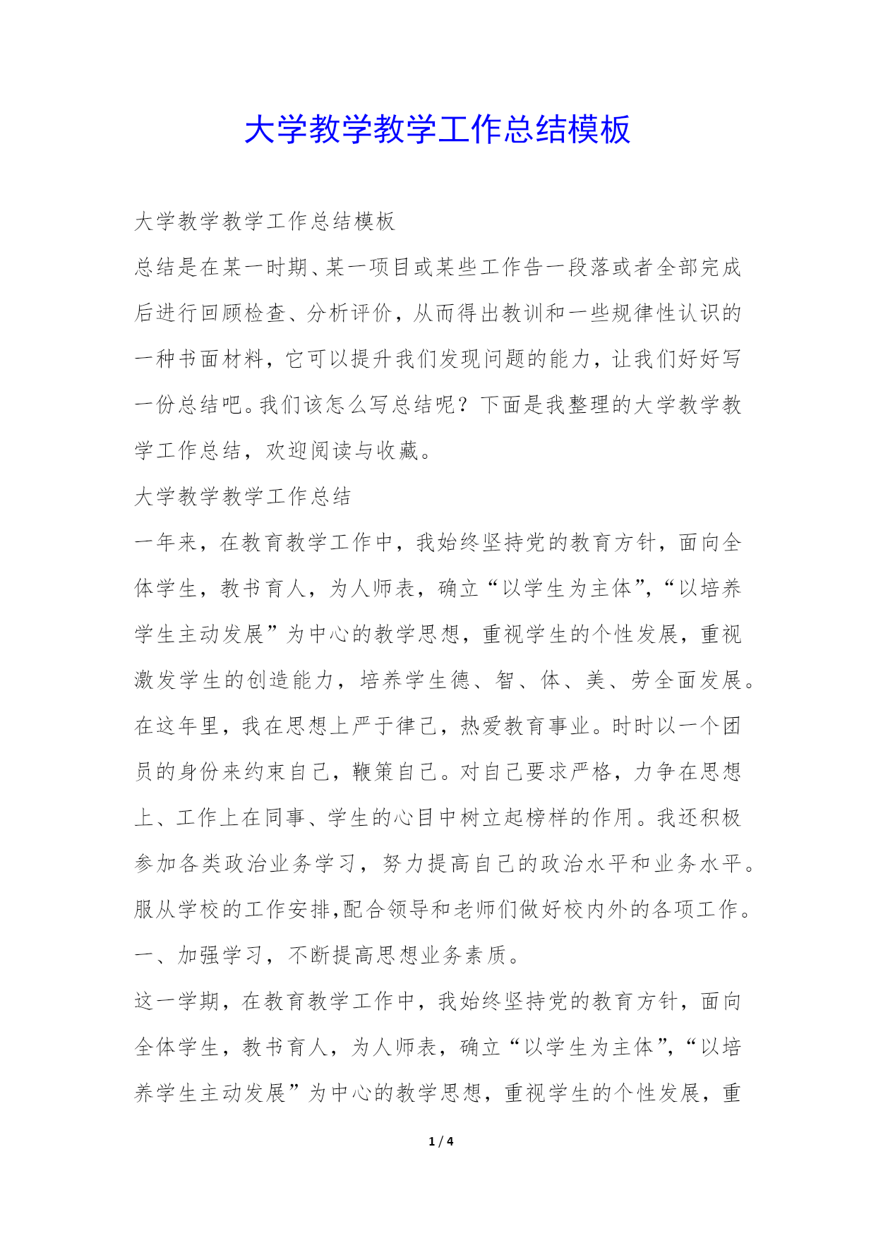 PAGE4/NUMPAGES4大学教学教学工作总结模板大学教学教学工作总结模板总结是在某一时期、某一项目或某些工作告一段落或者全部完成后进行回顾检查、分析评价,从而得出教训和一些规律性认识的一种书面材料,它可以提升我们发现问题的能力,让我们好好写一份总结吧。我们该怎么写总结呢?下面是我整理的大学教学教学工作总结,欢迎阅读与收藏。大学教学教学工作总结一年来,在教育教学工作中,我始终坚持党的教育方针,面向全体学生,教书育人,为人师表,确立“以学生为主体”,“以培养学生主动发展”为中心的教学思想,重