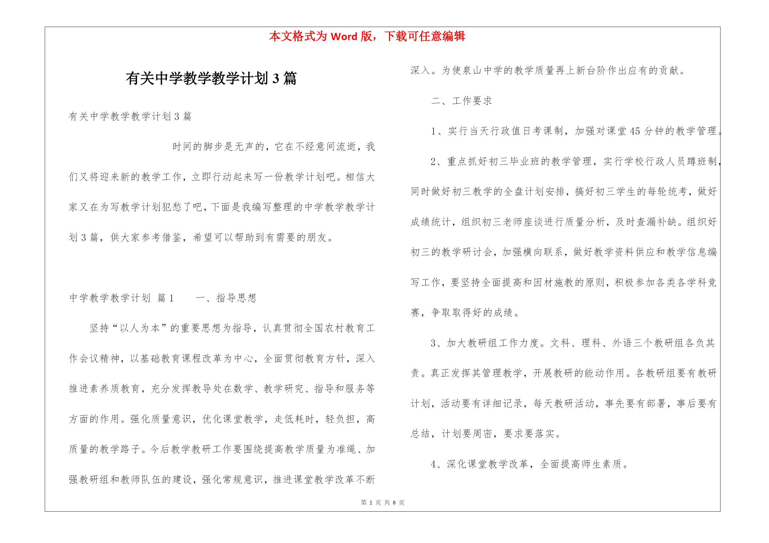 本文格式为Word版,下载可任意编辑第PAGE\*MERGEFORMAT8页共NUMPAGES\*MERGEFORMAT8页有关中学教学教学计划3篇有关中学教学教学计划3篇时间的脚步是无声的,它在不经意间流逝,我们又将迎来新的教学工作,立即行动起来写一份教学计划吧。相信大家又在为写教学计划犯愁了吧,下面是我编写整理的中学教学教学计划3篇,供大家参考借鉴,希望可以帮助到有需要的朋友。中学教学教学计划篇1一、指导思想坚持“以人为本”的重要思想为指导,认真贯彻全国农村教育工作会议精神,以基础教育课程