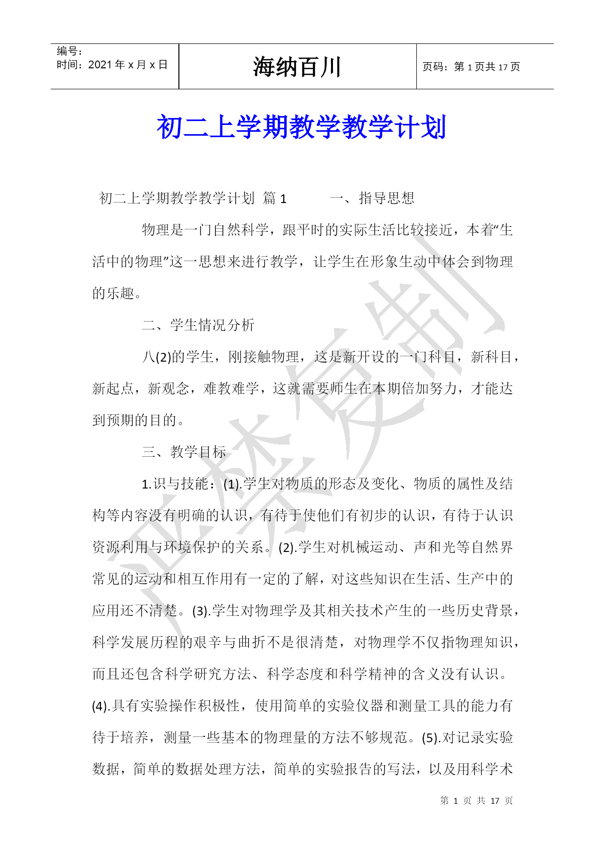 编号:时间:2021年x月x日海纳百川页码:第PAGE17页共NUMPAGES17页第PAGE\*MERGEFORMAT17页共NUMPAGES\*MERGEFORMAT17页初二上学期教学教学计划初二上学期教学教学计划篇1一、指导思想物理是一门自然科学,跟平时的实际生活比较接近,本着“生活中的物理”这一思想来进行教学,让学生在形象生动中体会到物理的乐趣。二、学生情况分析八(2)的学生,刚接触物理,这是新开设的一门科目,新科目,新起点,新观念,难教难学,这就需要师生在本期倍加努力,