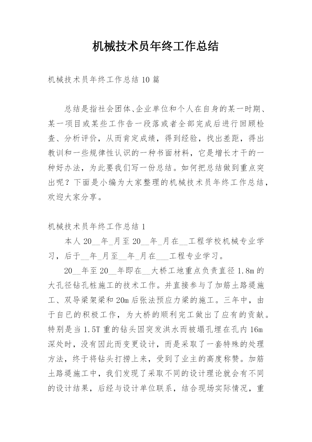 机械技术员年终工作总结机械技术员年终工作总结10篇总结是指社会团体、企业单位和个人在自身的某一时期、某一项目或某些工作告一段落或者全部完成后进行回顾检查、分析评价,从而肯定成绩,得到经验,找出差距,得出教训和一些规律性认识的一种书面材料,它是增长才干的一种好办法,为此要我们写一份总结。如何把总结做到重点突出呢?下面是小编为大家整理的机械技术员年终工作总结,欢迎大家分享。机械技术员年终工作总结1本人20__年_月至20__年_月在__工程学校机械专业学习,后于__年_月至__年_月在___工程专业学习。20