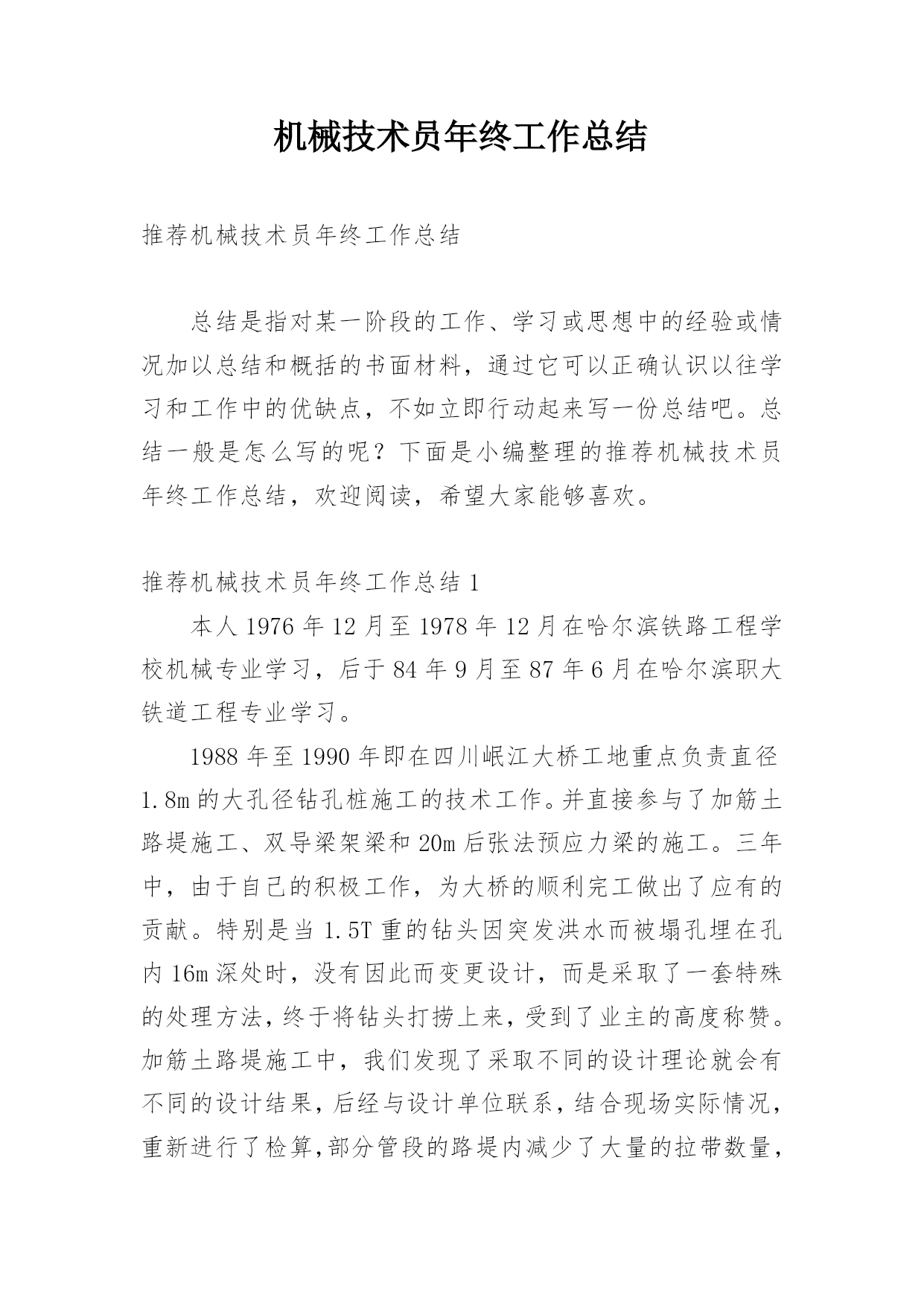 机械技术员年终工作总结推荐机械技术员年终工作总结总结是指对某一阶段的工作、学习或思想中的经验或情况加以总结和概括的书面材料,通过它可以正确认识以往学习和工作中的优缺点,不如立即行动起来写一份总结吧。总结一般是怎么写的呢?下面是小编整理的推荐机械技术员年终工作总结,欢迎阅读,希望大家能够喜欢。推荐机械技术员年终工作总结1本人1976年12月至1978年12月在哈尔滨铁路工程学校机械专业学习,后于84年9月至87年6月在哈尔滨职大铁道工程专业学习。1988年至1990年即在四川岷江大桥工地重点负责直径1.8m