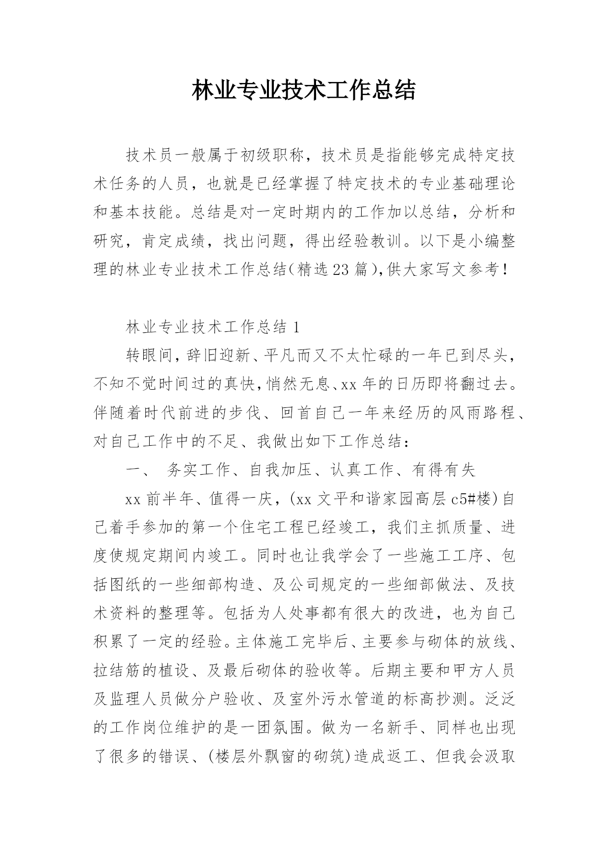 林业专业技术工作总结技术员一般属于初级职称,技术员是指能够完成特定技术任务的人员,也就是已经掌握了特定技术的专业基础理论和基本技能。总结是对一定时期内的工作加以总结,分析和研究,肯定成绩,找出问题,得出经验教训。以下是小编整理的林业专业技术工作总结(精选23篇),供大家写文参考!林业专业技术工作总结1转眼间,辞旧迎新、平凡而又不太忙碌的一年已到尽头,不知不觉时间过的真快,悄然无息、xx年的日历即将翻过去。伴随着时代前进的步伐、回首自己一年来经历的风雨路程、对自己工作中的不足、我做出如下工作总结:一、务实工