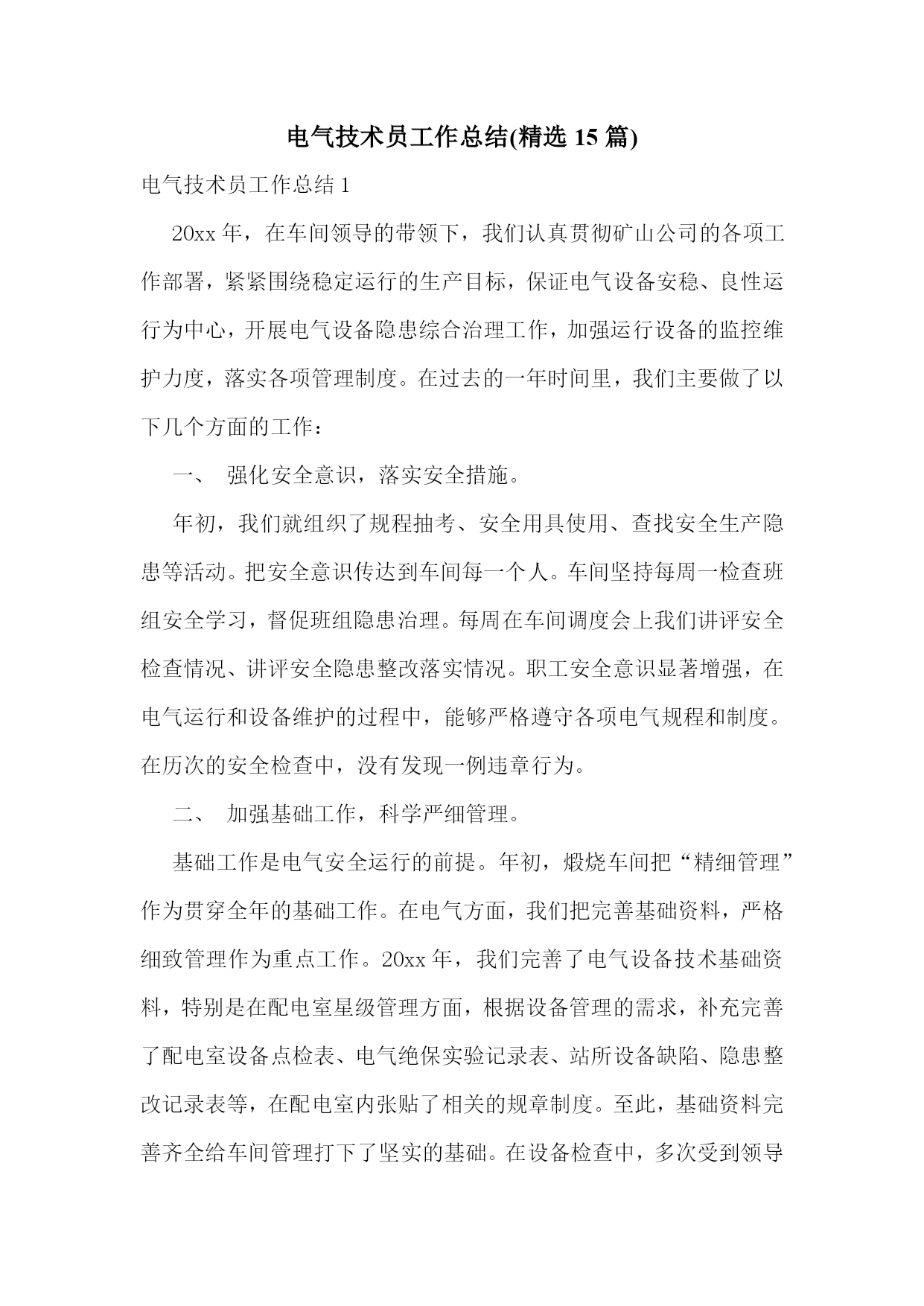 电气技术员工作总结(精选15篇)电气技术员工作总结120xx年,在车间领导的带领下,我们认真贯彻矿山公司的各项工作部署,紧紧围绕稳定运行的生产目标,保证电气设备安稳、良性运行为中心,开展电气设备隐患综合治理工作,加强运行设备的监控维护力度,落实各项管理制度。在过去的一年时间里,我们主要做了以下几个方面的工作:一、强化安全意识,落实安全措施。年初,我们就组织了规程抽考、安全用具使用、查找安全生产隐患等活动。把安全意识传达到车间每一个人。车间坚持每周一检查班组安全学习,督促班组隐患治理。每周在车间调度会上我们