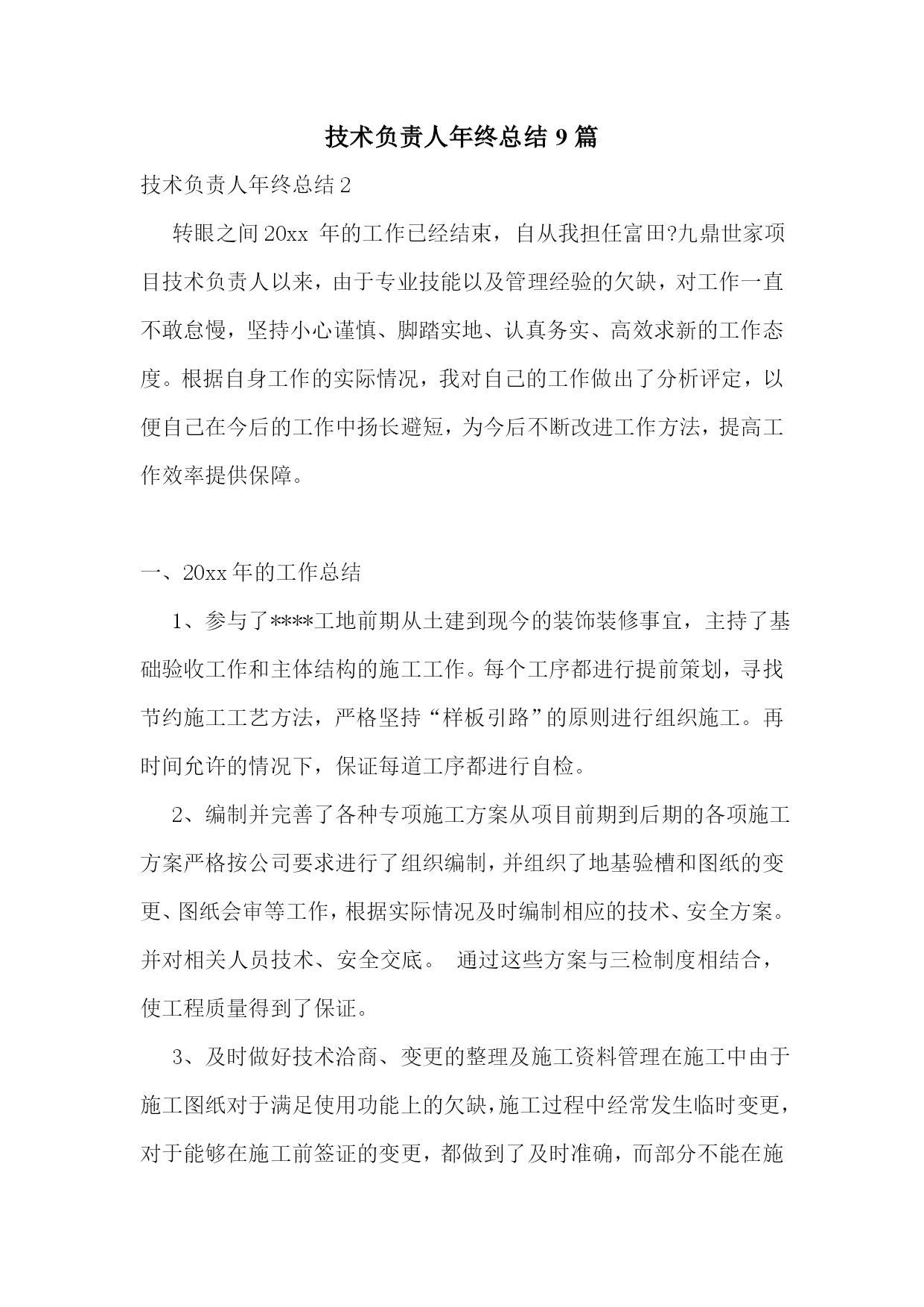 技术负责人年终总结9篇技术负责人年终总结2转眼之间20xx年的工作已经结束,自从我担任富田?九鼎世家项目技术负责人以来,由于专业技能以及管理经验的欠缺,对工作一直不敢怠慢,坚持小心谨慎、脚踏实地、认真务实、高效求新的工作态度。根据自身工作的实际情况,我对自己的工作做出了分析评定,以便自己在今后的工作中扬长避短,为今后不断改进工作方法,提高工作效率提供保障。一、20xx年的工作总结1、参与了****工地前期从土建到现今的装饰装修事宜,主持了基础验收工作和主体结构的施工工作。每个工序都进行提前策划,寻找节约施