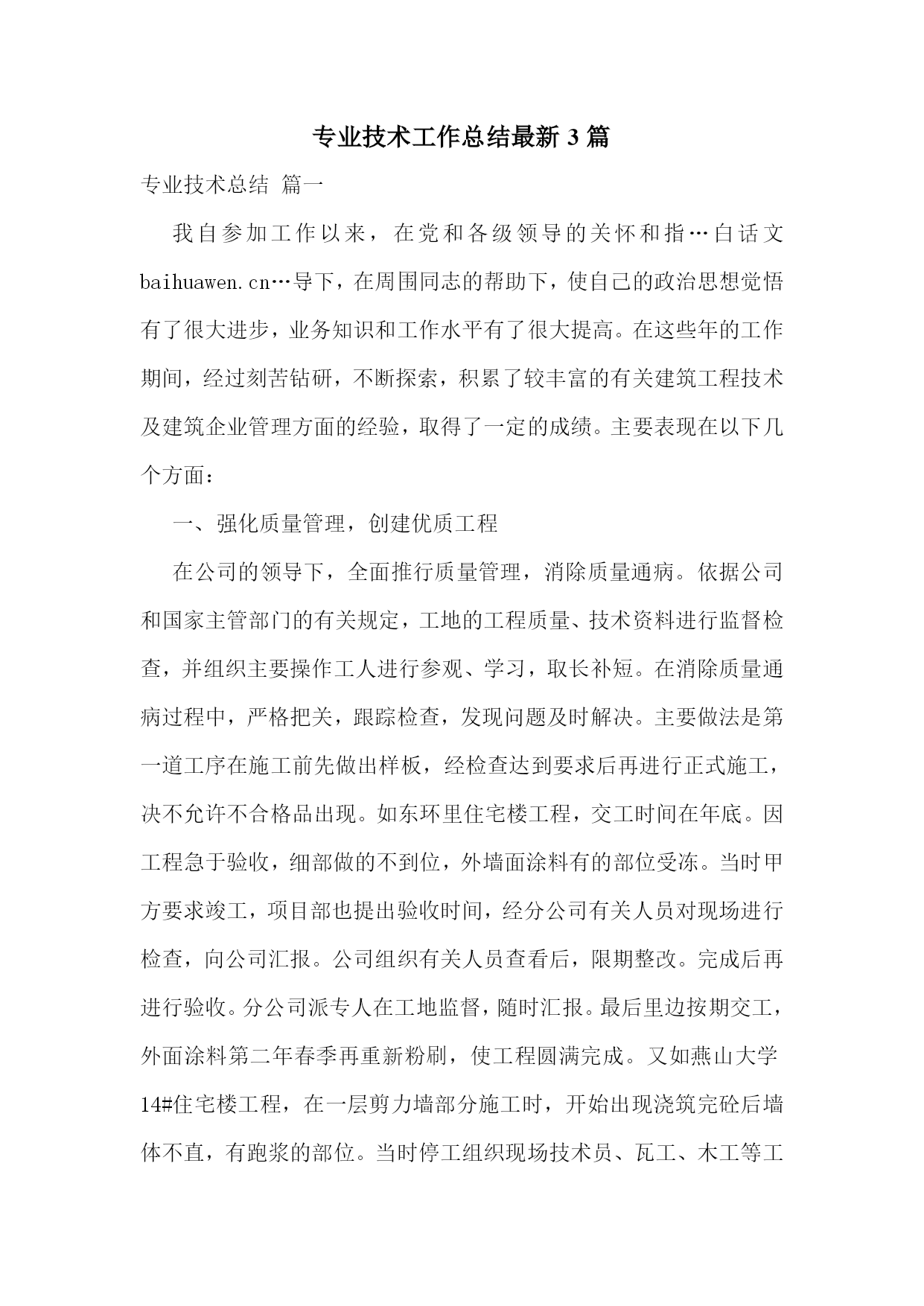 专业技术工作总结最新3篇专业技术总结篇一我自参加工作以来,在党和各级领导的关怀和指…白话文baihuawen.cn…导下,在周围同志的帮助下,使自己的政治思想觉悟有了很大进步,业务知识和工作水平有了很大提高。在这些年的工作期间,经过刻苦钻研,不断探索,积累了较丰富的有关建筑工程技术及建筑企业管理方面的经验,取得了一定的成绩。主要表现在以下几个方面:一、强化质量管理,创建优质工程在公司的领导下,全面推行质量管理,消除质量通病。依据公司和国家主管部门的有关规定,工地的工程质量、技术资料进行监督检查,并组织主要