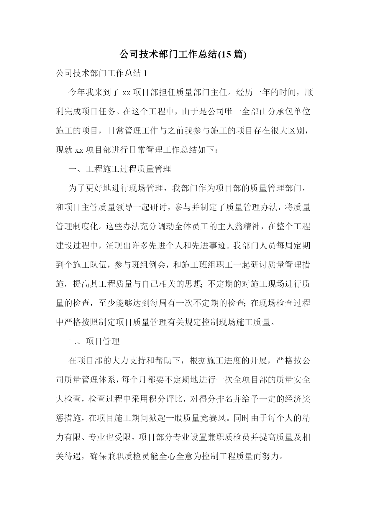 公司技术部门工作总结(15篇)公司技术部门工作总结1今年我来到了xx项目部担任质量部门主任。经历一年的时间,顺利完成项目任务。在这个工程中,由于是公司唯一全部由分承包单位施工的项目,日常管理工作与之前我参与施工的项目存在很大区别,现就xx项目部进行日常管理工作总结如下:一、工程施工过程质量管理为了更好地进行现场管理,我部门作为项目部的质量管理部门,和项目主管质量领导一起研讨,参与并制定了质量管理办法,将质量管理制度化。这些办法充分调动全体员工的主人翁精神,在整个工程建设过程中,涌现出许多先进个人和先进事迹