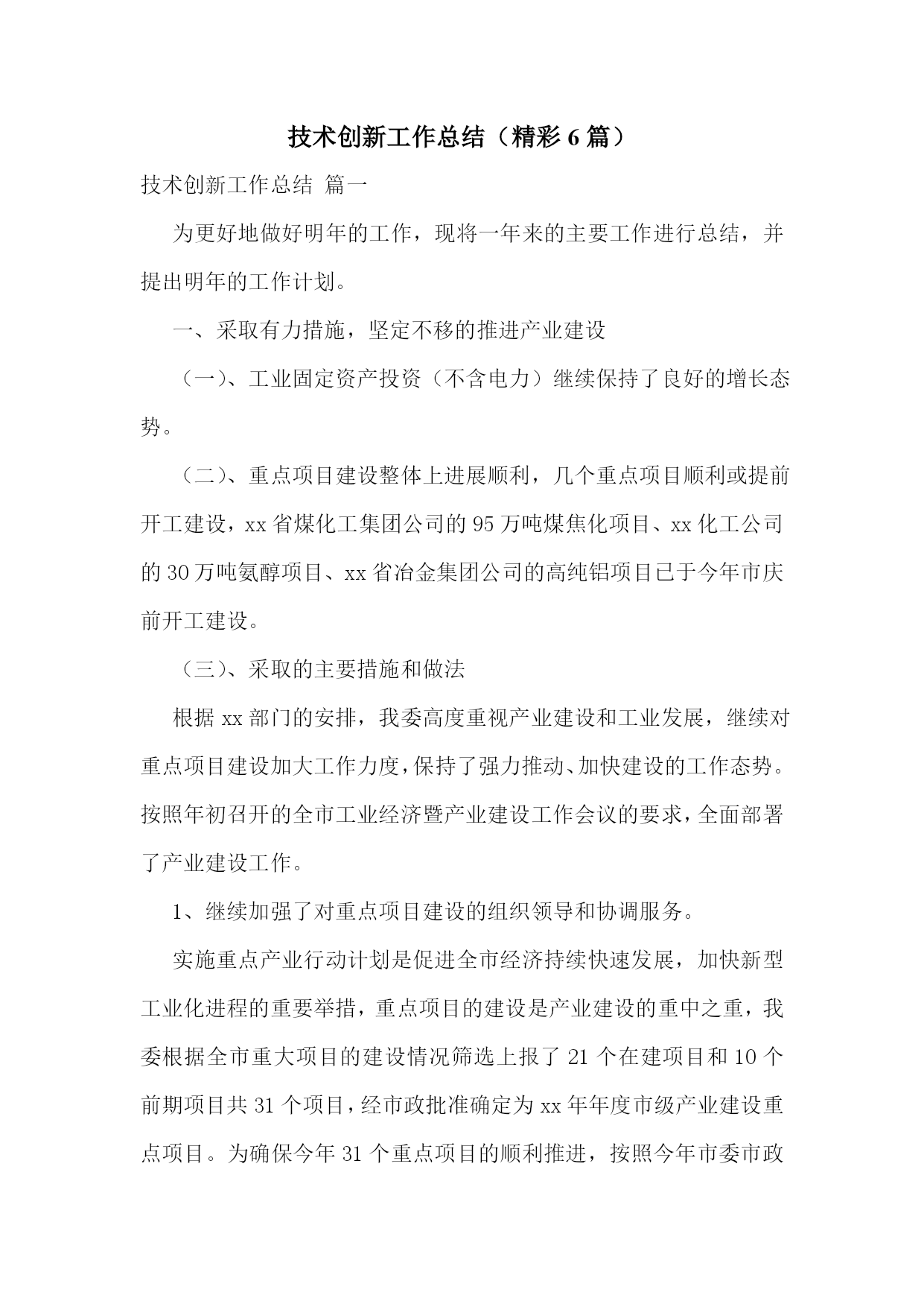 技术创新工作总结(精彩6篇)技术创新工作总结篇一为更好地做好明年的工作,现将一年来的主要工作进行总结,并提出明年的工作计划。一、采取有力措施,坚定不移的推进产业建设(一)、工业固定资产投资(不含电力)继续保持了良好的增长态势。(二)、重点项目建设整体上进展顺利,几个重点项目顺利或提前开工建设,xx省煤化工集团公司的95万吨煤焦化项目、xx化工公司的30万吨氨醇项目、xx省冶金集团公司的高纯铝项目已于今年市庆前开工建设。(三)、采取的主要措施和做法根据xx部门的安排,我委高度重视产业建设和工业发展,继续对重