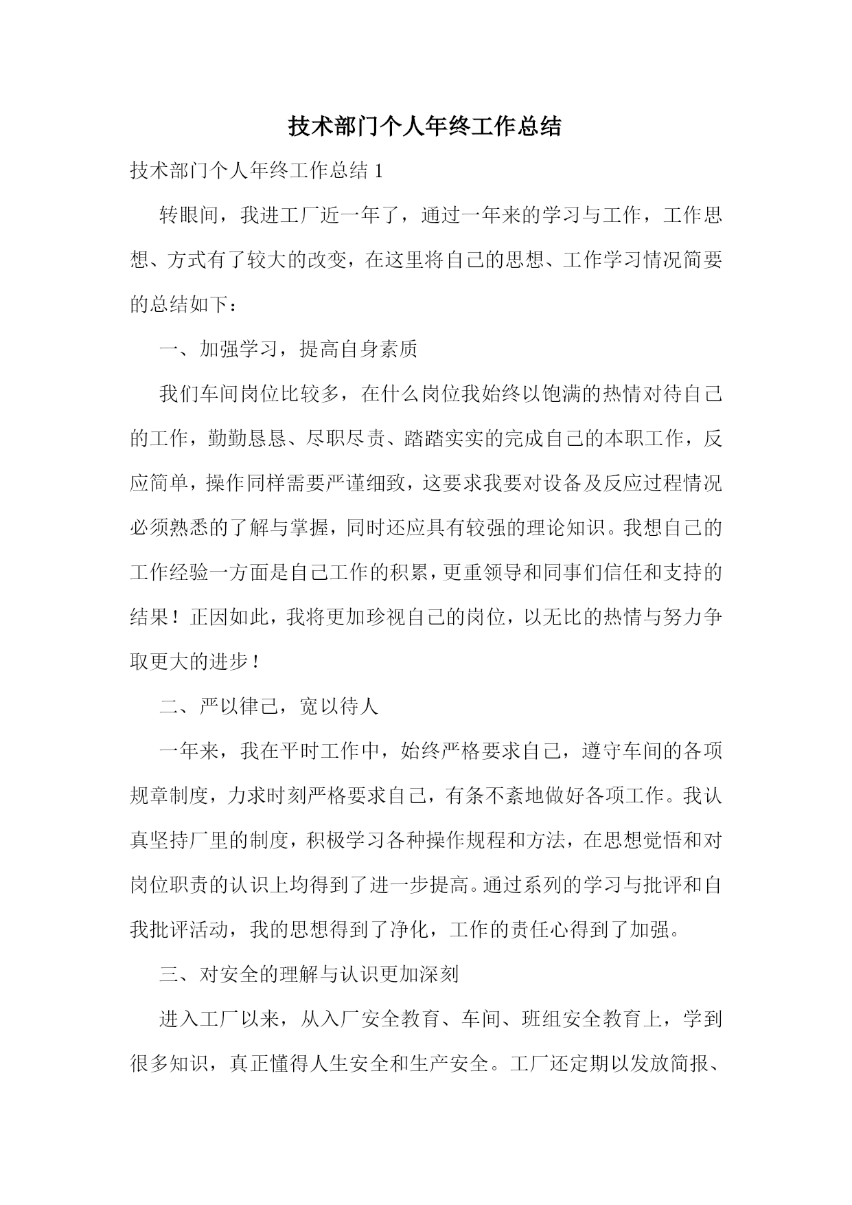 技术部门个人年终工作总结技术部门个人年终工作总结1转眼间,我进工厂近一年了,通过一年来的学习与工作,工作思想、方式有了较大的改变,在这里将自己的思想、工作学习情况简要的总结如下:一、加强学习,提高自身素质我们车间岗位比较多,在什么岗位我始终以饱满的热情对待自己的工作,勤勤恳恳、尽职尽责、踏踏实实的完成自己的本职工作,反应简单,操作同样需要严谨细致,这要求我要对设备及反应过程情况必须熟悉的了解与掌握,同时还应具有较强的理论知识。我想自己的工作经验一方面是自己工作的积累,更重领导和同事们信任和支持的结果!正因