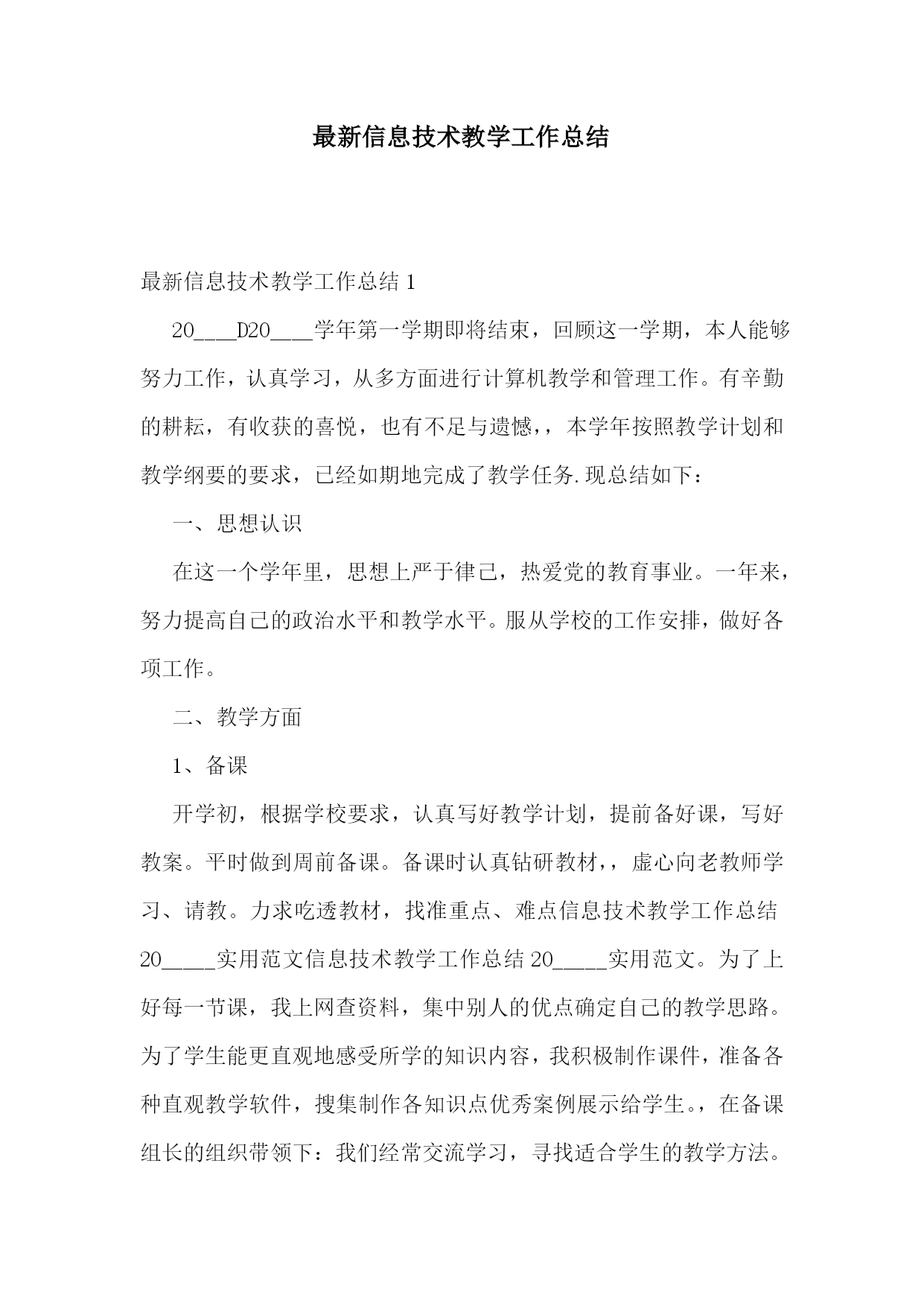 最新信息技术教学工作总结最新信息技术教学工作总结120____D20____学年第一学期即将结束,回顾这一学期,本人能够努力工作,认真学习,从多方面进行计算机教学和管理工作。有辛勤的耕耘,有收获的喜悦,也有不足与遗憾,,本学年按照教学计划和教学纲要的要求,已经如期地完成了教学任务.现总结如下:一、思想认识在这一个学年里,思想上严于律己,热爱党的教育事业。一年来,努力提高自己的政治水平和教学水平。服从学校的工作安排,做好各项工作。二、教学方面1、备课开学初,根据学校要求,认真写好教学计划,提前备好课,写好教