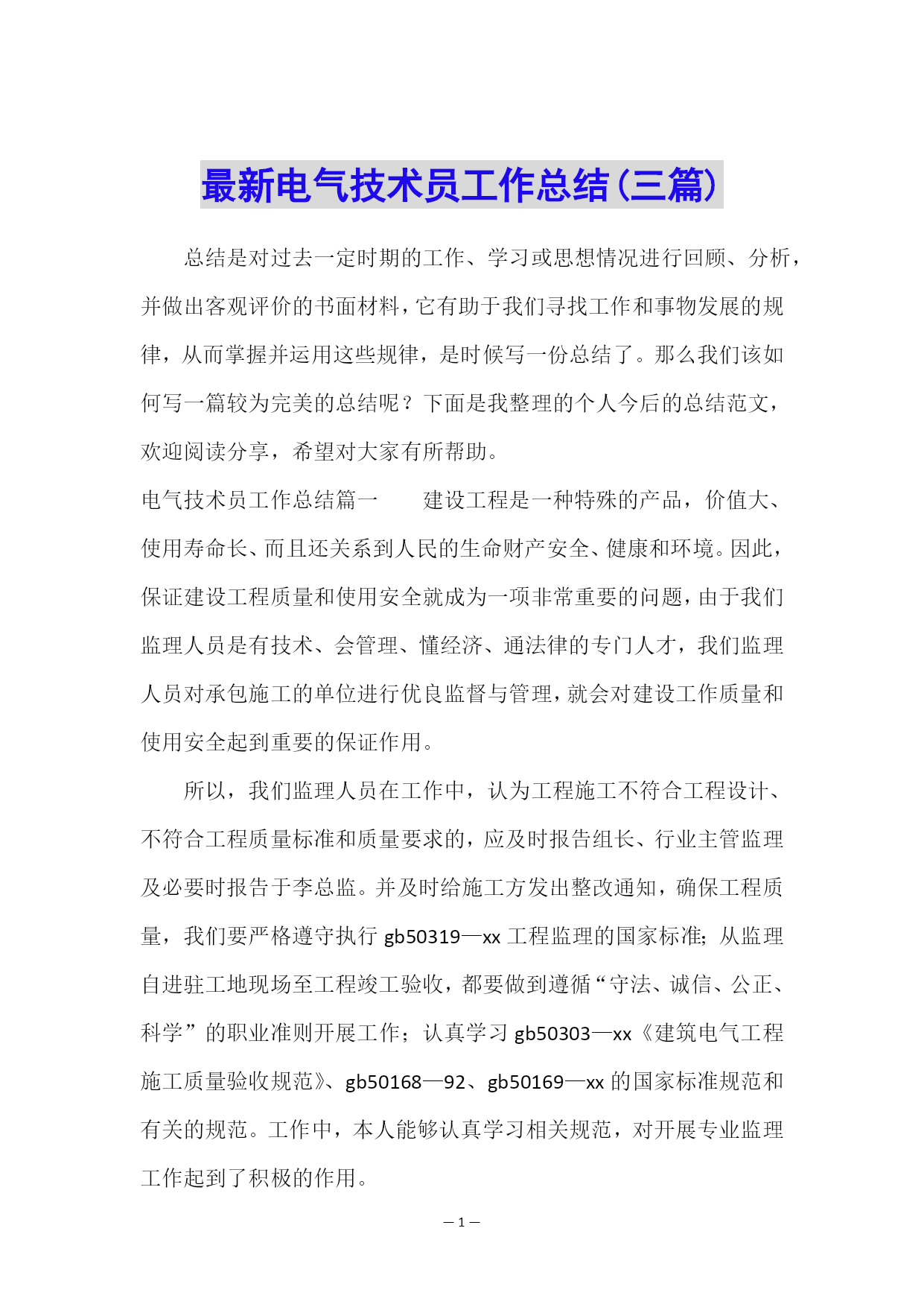 —PAGE\*MERGEFORMAT9—最新电气技术员工作总结(三篇)总结是对过去一定时期的工作、学习或思想情况进行回顾、分析,并做出客观评价的书面材料,它有助于我们寻找工作和事物发展的规律,从而掌握并运用这些规律,是时候写一份总结了。那么我们该如何写一篇较为完美的总结呢?下面是我整理的个人今后的总结范文,欢迎阅读分享,希望对大家有所帮助。电气技术员工作总结篇一建设工程是一种特殊的产品,价值大、使用寿命长、而且还关系到人民的生命财产安全、健康和环境。因此,保证建设工程质量和使用安全就成为一项非常重要
