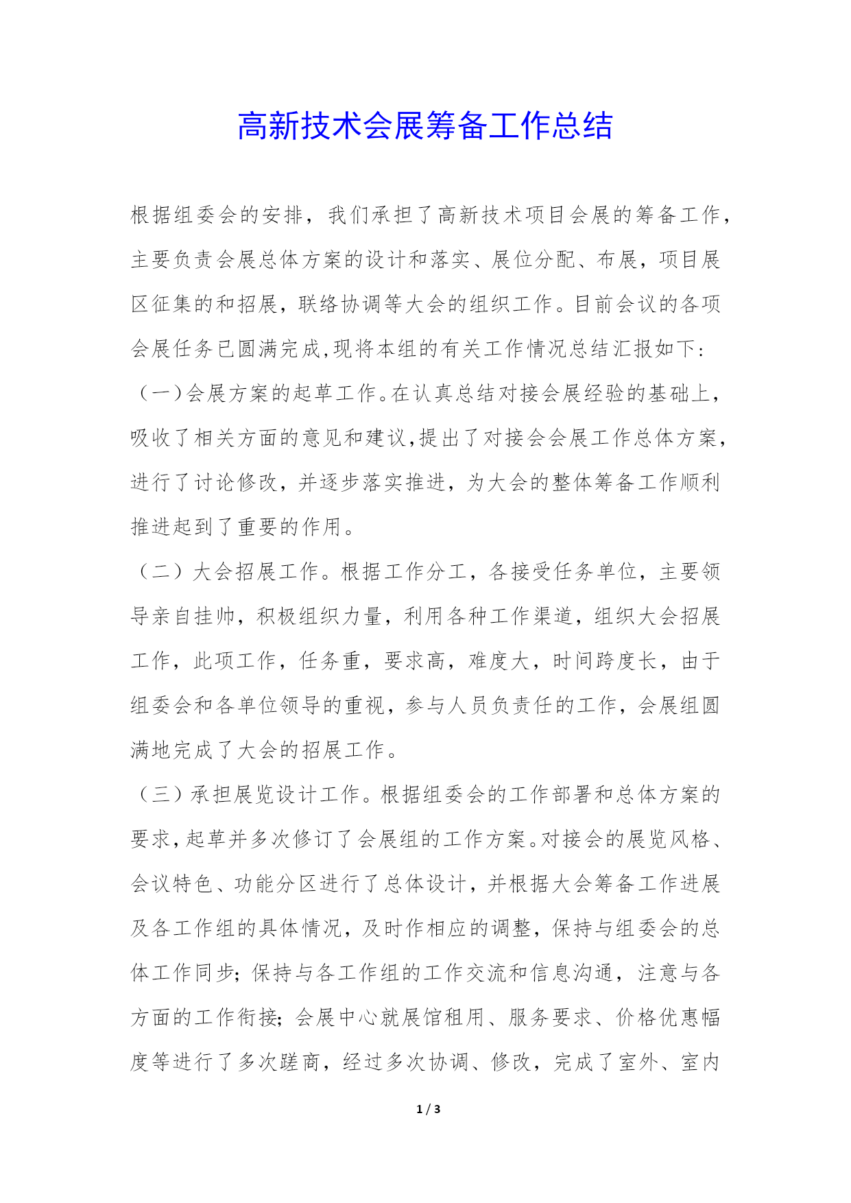 PAGE3/NUMPAGES3高新技术会展筹备工作总结根据组委会的安排,我们承担了高新技术项目会展的筹备工作,主要负责会展总体方案的设计和落实、展位分配、布展,项目展区征集的和招展,联络协调等大会的组织工作。目前会议的各项会展任务已圆满完成,现将本组的有关工作情况总结汇报如下:(一)会展方案的起草工作。在认真总结对接会展经验的基础上,吸收了相关方面的意见和建议,提出了对接会会展工作总体方案,进行了讨论修改,并逐步落实推进,为大会的整体筹备工作顺利推进起到了重要的作用。(二)大会招展工作。根据工