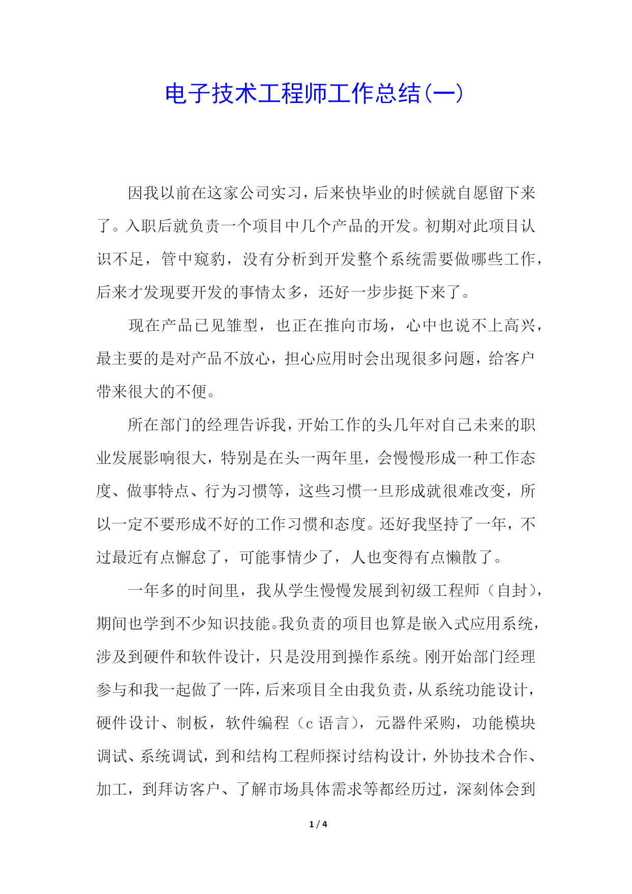 PAGE4/NUMPAGES4电子技术工程师工作总结(一)因我以前在这家公司实习,后来快毕业的时候就自愿留下来了。入职后就负责一个项目中几个产品的开发。初期对此项目认识不足,管中窥豹,没有分析到开发整个系统需要做哪些工作,后来才发现要开发的事情太多,还好一步步挺下来了。现在产品已见雏型,也正在推向市场,心中也说不上高兴,最主要的是对产品不放心,担心应用时会出现很多问题,给客户带来很大的不便。所在部门的经理告诉我,开始工作的头几年对自己未来的职业发展影响很大,特别是在头一两年里,会慢慢形成一种工