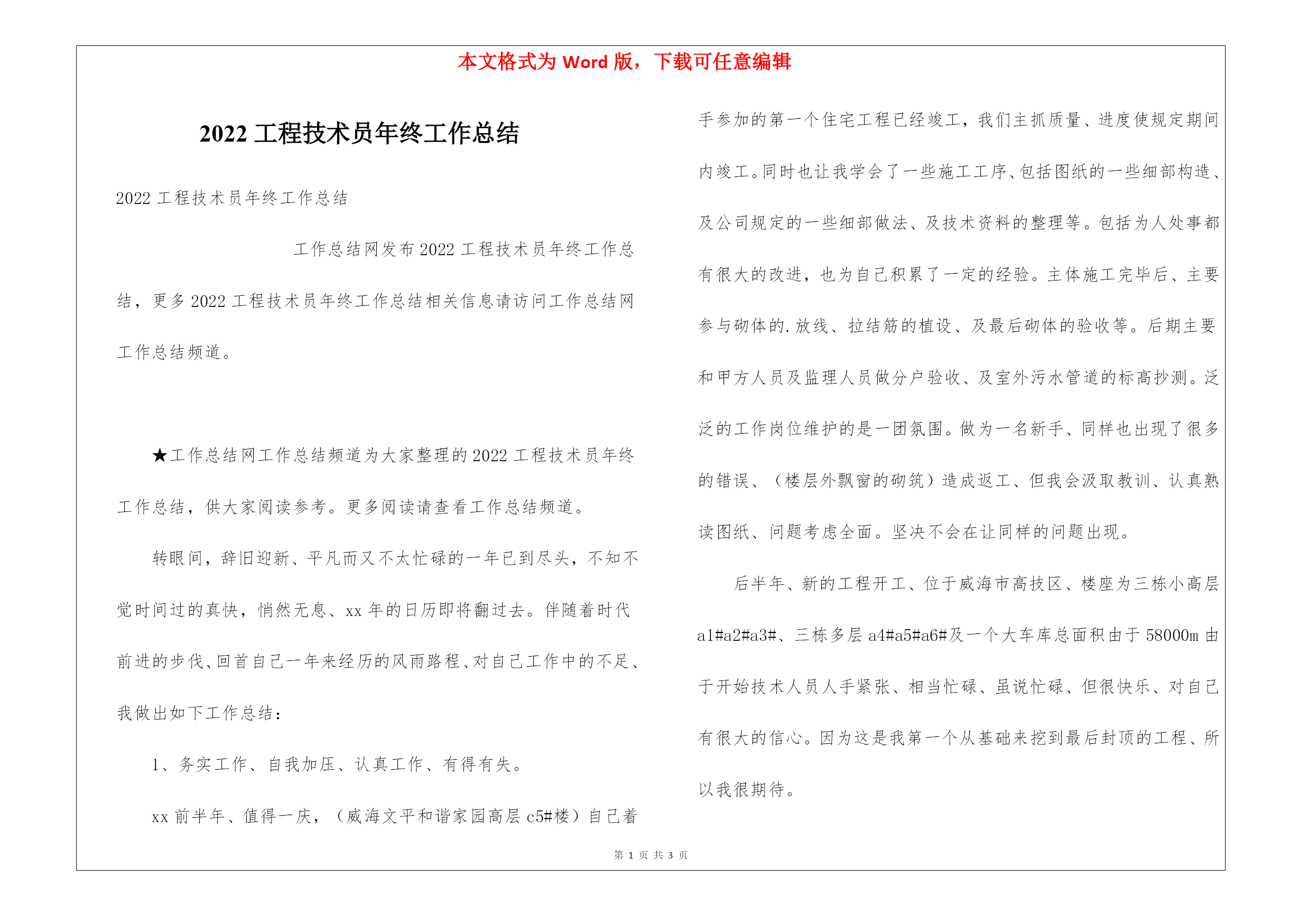 本文格式为Word版,下载可任意编辑第PAGE\*MERGEFORMAT3页共NUMPAGES\*MERGEFORMAT3页2022工程技术员年终工作总结2022工程技术员年终工作总结工作总结网发布2022工程技术员年终工作总结,更多2022工程技术员年终工作总结相关信息请访问工作总结网工作总结频道。★工作总结网工作总结频道为大家整理的2022工程技术员年终工作总结,供大家阅读参考。更多阅读请查看工作总结频道。转眼间,辞旧迎新、平凡而又不太忙碌的一年已到尽头,不知不觉时间过的真快,悄然无息、x