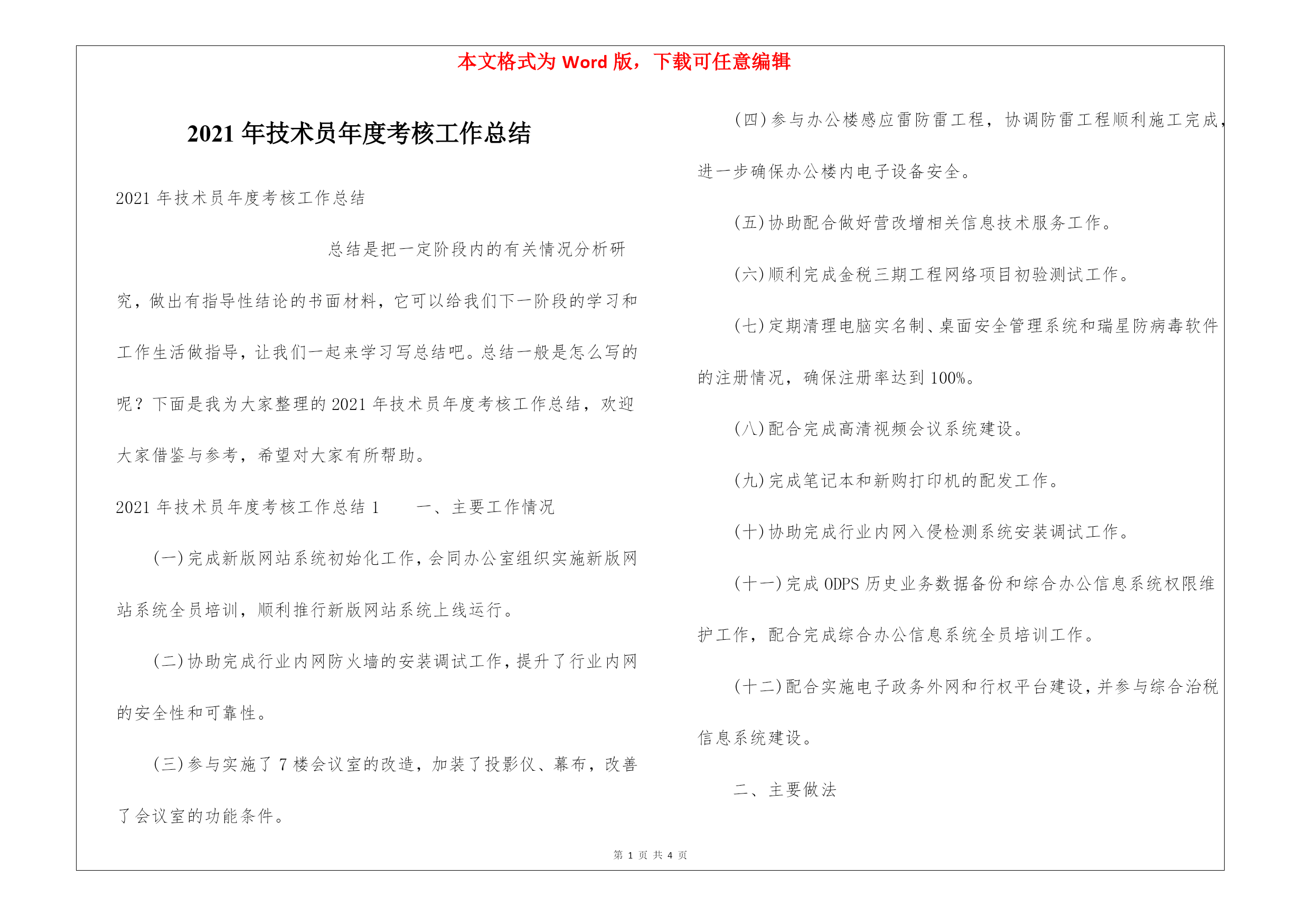 本文格式为Word版,下载可任意编辑第PAGE\*MERGEFORMAT4页共NUMPAGES\*MERGEFORMAT4页2021年技术员年度考核工作总结2021年技术员年度考核工作总结总结是把一定阶段内的有关情况分析研究,做出有指导性结论的书面材料,它可以给我们下一阶段的学习和工作生活做指导,让我们一起来学习写总结吧。总结一般是怎么写的呢?下面是我为大家整理的2021年技术员年度考核工作总结,欢迎大家借鉴与参考,希望对大家有所帮助。2021年技术员年度考核工作总结1一、主要工作情况(一)完