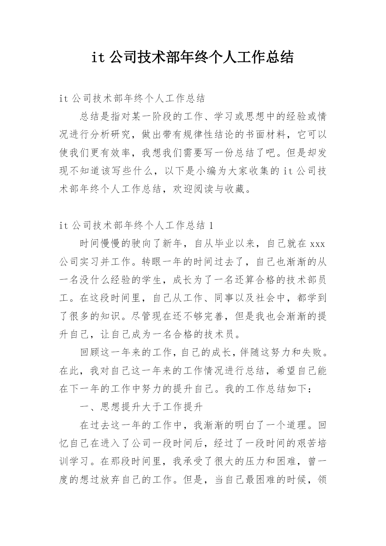it公司技术部年终个人工作总结it公司技术部年终个人工作总结总结是指对某一阶段的工作、学习或思想中的经验或情况进行分析研究,做出带有规律性结论的书面材料,它可以使我们更有效率,我想我们需要写一份总结了吧。但是却发现不知道该写些什么,以下是小编为大家收集的it公司技术部年终个人工作总结,欢迎阅读与收藏。it公司技术部年终个人工作总结1时间慢慢的驶向了新年,自从毕业以来,自己就在xxx公司实习并工作。转眼一年的时间过去了,自己也渐渐的从一名没什么经验的学生,成长为了一名还算合格的技术部员工。在这段时间里,自己