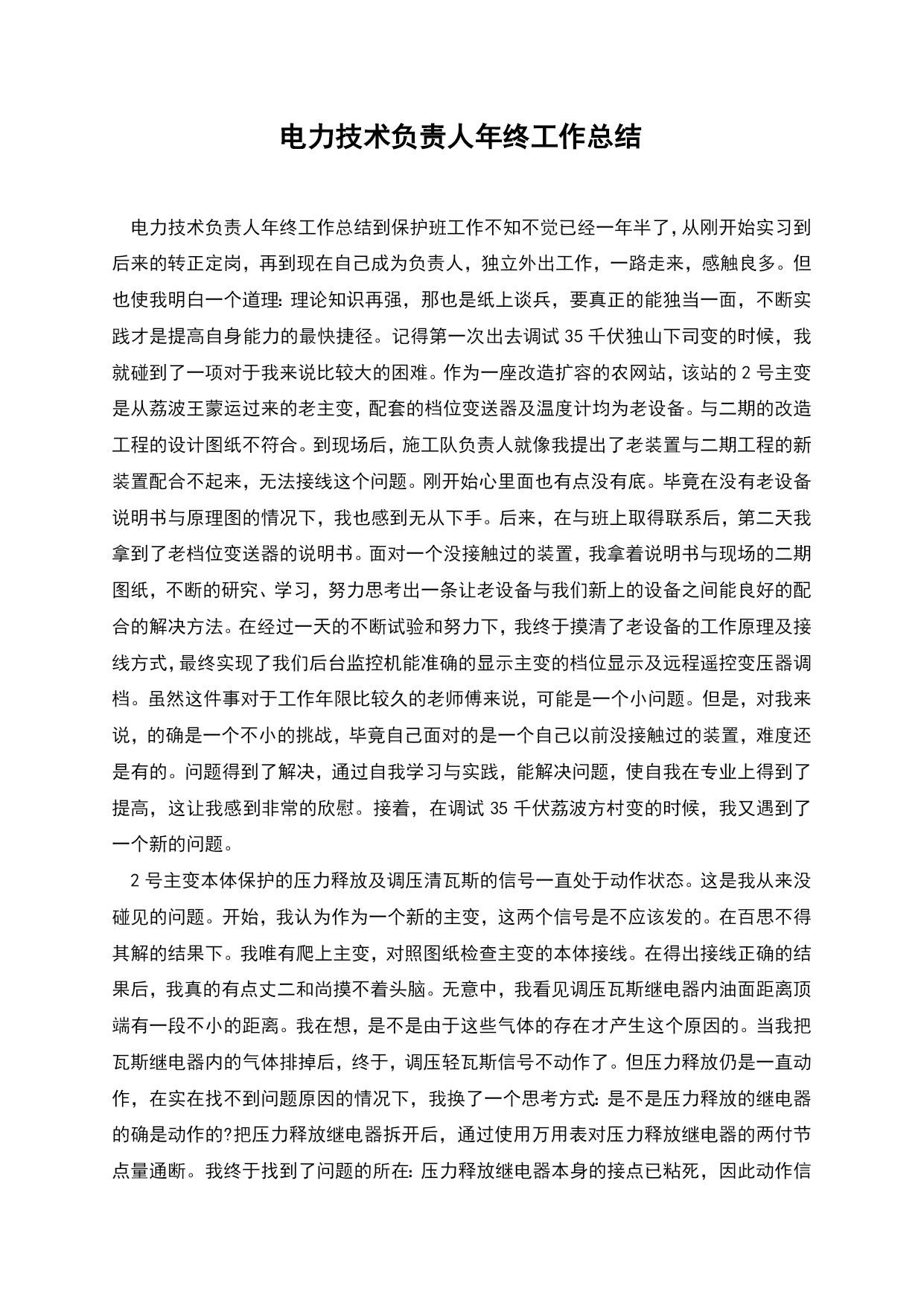 电力技术负责人年终工作总结电力技术负责人年终工作总结到保护班工作不知不觉已经一年半了,从刚开始实习到后来的转正定岗,再到现在自己成为负责人,独立外出工作,一路走来,感触良多。但也使我明白一个道理:理论知识再强,那也是纸上谈兵,要真正的能独当一面,不断实践才是提高自身能力的最快捷径。记得第一次出去调试35千伏独山下司变的时候,我就碰到了一项对于我来说比较大的困难。作为一座改造扩容的农网站,该站的2号主变是从荔波王蒙运过来的老主变,配套的档位变送器及温度计均为老设备。与二期的改造工程的设计图纸不符合。到现场后