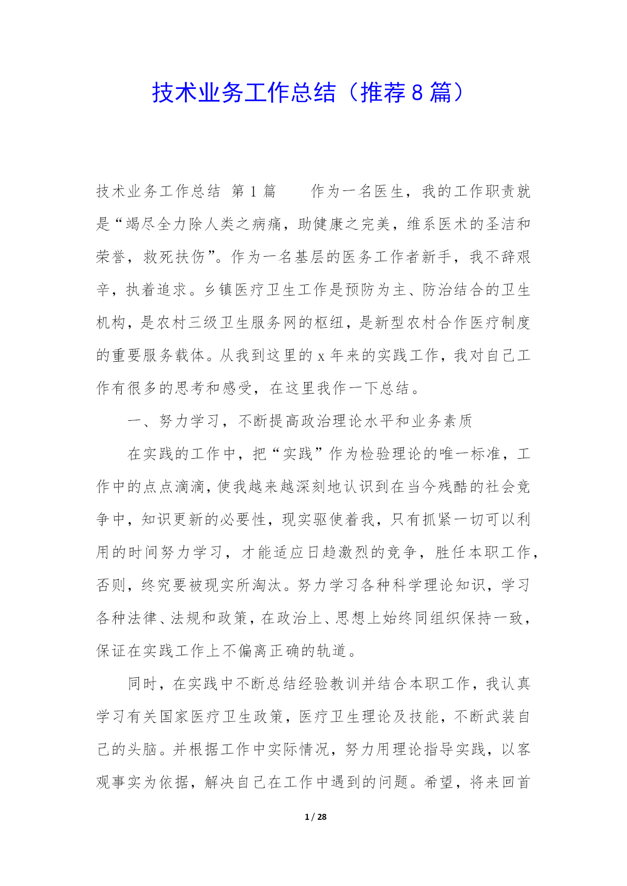 PAGE28/NUMPAGES28技术业务工作总结(推荐8篇)技术业务工作总结第1篇作为一名医生,我的工作职责就是“竭尽全力除人类之病痛,助健康之完美,维系医术的圣洁和荣誉,救死扶伤”。作为一名基层的医务工作者新手,我不辞艰辛,执着追求。乡镇医疗卫生工作是预防为主、防治结合的卫生机构,是农村三级卫生服务网的枢纽,是新型农村合作医疗制度的重要服务载体。从我到这里的x年来的实践工作,我对自己工作有很多的思考和感受,在这里我作一下总结。一、努力学习,不断提高政治理论水平和业务素质在实践的工作中,把“