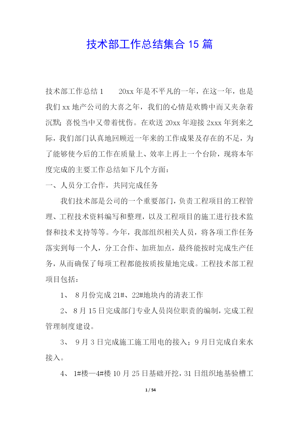 PAGE54/NUMPAGES54技术部工作总结集合15篇技术部工作总结120xx年是不平凡的一年,在这一年,也是我们xx地产公司的大喜之年,我们的心情是欢腾中而又夹杂着沉默;喜悦当中又带着忧伤。在欢送20xx年迎接2xxx年到来之际,我们部门认真地回顾近一年来的工作成果及存在的不足,为了能够使今后的工作在质量上、效率上再上一个台阶,现将本年度完成的主要工作总结如下几个方面:一、人员分工合作,共同完成任务我们技术部是公司的一个重要部门,负责工程项目的工程管理、工程技术资料编写和整理,以及工程项