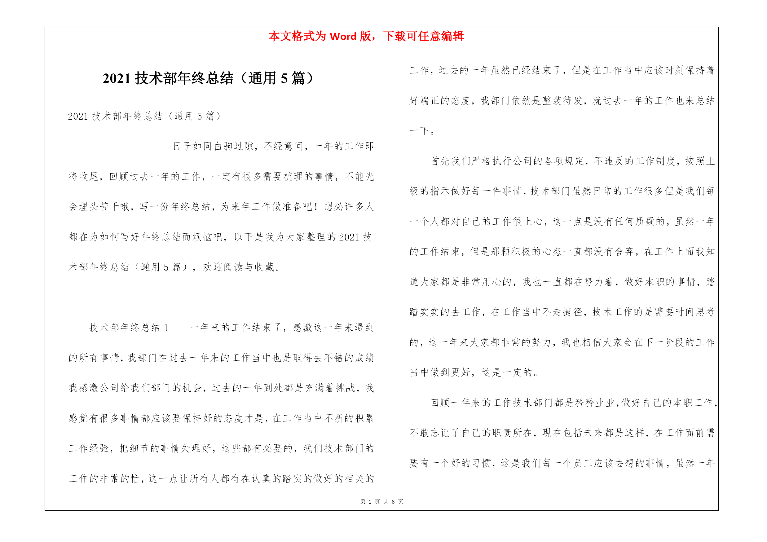 本文格式为Word版,下载可任意编辑第PAGE\*MERGEFORMAT8页共NUMPAGES\*MERGEFORMAT8页2021技术部年终总结(通用5篇)2021技术部年终总结(通用5篇)日子如同白驹过隙,不经意间,一年的工作即将收尾,回顾过去一年的工作,一定有很多需要梳理的事情,不能光会埋头苦干哦,写一份年终总结,为来年工作做准备吧!想必许多人都在为如何写好年终总结而烦恼吧,以下是我为大家整理的2021技术部年终总结(通用5篇),欢迎阅读与收藏。技术部年终总结1一年来的工作结束了,感激这