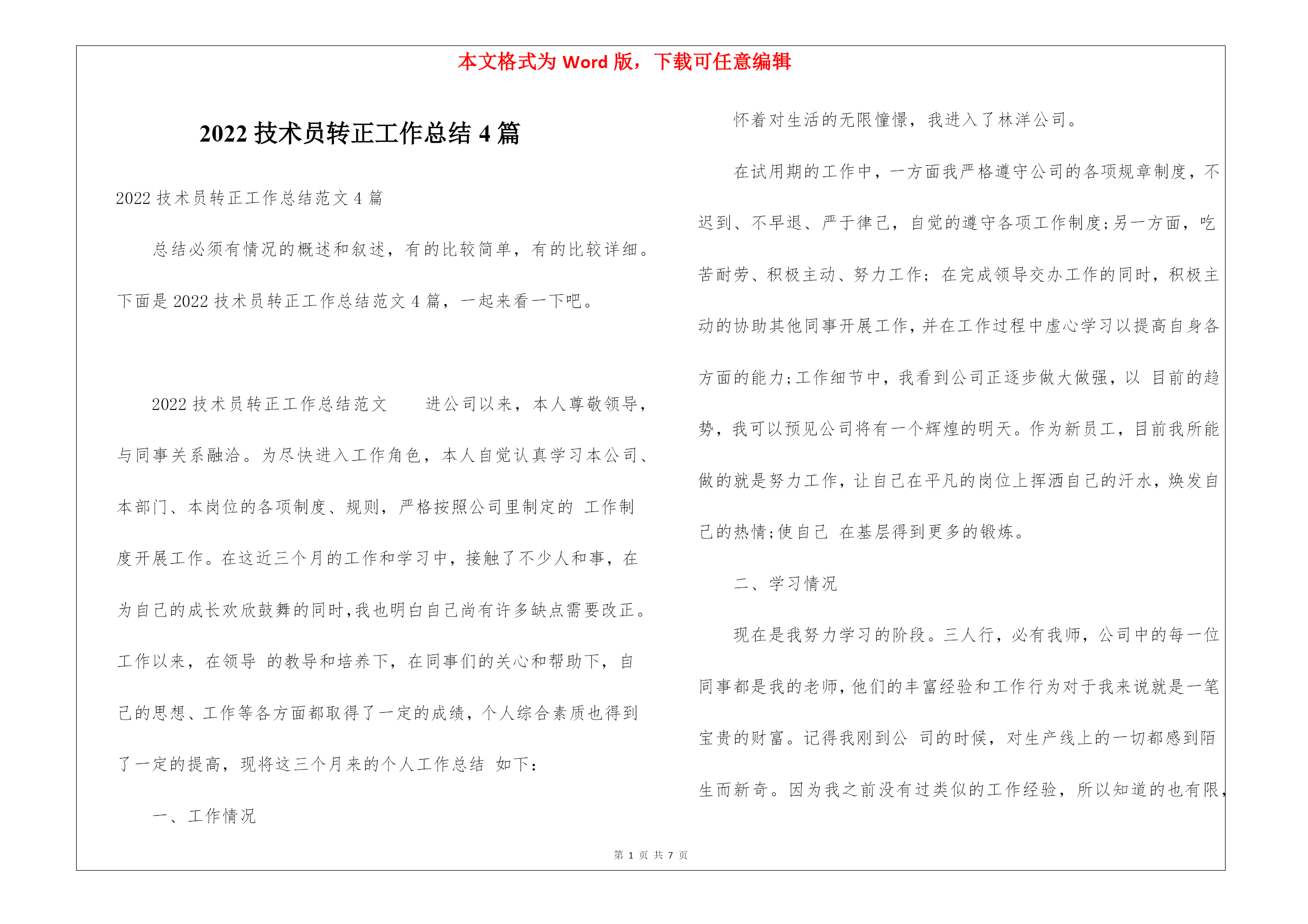本文格式为Word版,下载可任意编辑第PAGE\*MERGEFORMAT7页共NUMPAGES\*MERGEFORMAT7页2022技术员转正工作总结4篇2022技术员转正工作总结范文4篇总结必须有情况的概述和叙述,有的比较简单,有的比较详细。下面是2022技术员转正工作总结范文4篇,一起来看一下吧。2022技术员转正工作总结范文进公司以来,本人尊敬领导,与同事关系融洽。为尽快进入工作角色,本人自觉认真学习本公司、本部门、本岗位的各项制度、规则,严格按照公司里制定的工作制度开展工作。在这近三个