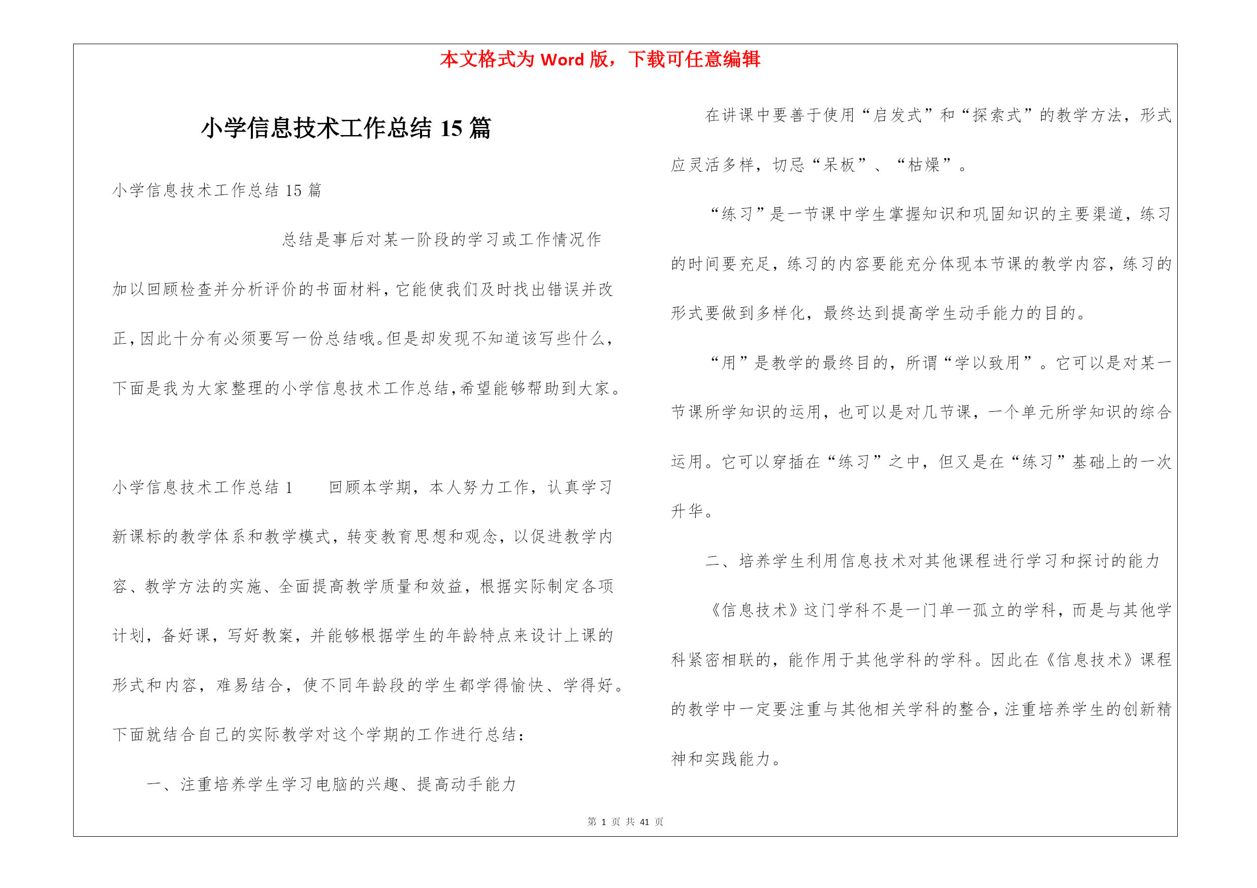本文格式为Word版,下载可任意编辑第PAGE\*MERGEFORMAT41页共NUMPAGES\*MERGEFORMAT41页小学信息技术工作总结15篇小学信息技术工作总结15篇总结是事后对某一阶段的学习或工作情况作加以回顾检查并分析评价的书面材料,它能使我们及时找出错误并改正,因此十分有必须要写一份总结哦。但是却发现不知道该写些什么,下面是我为大家整理的小学信息技术工作总结,希望能够帮助到大家。小学信息技术工作总结1回顾本学期,本人努力工作,认真学习新课标的教学体系和教学模式,转变教育思想