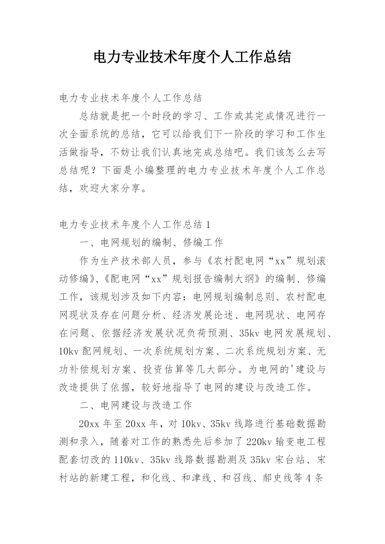 电力专业技术年度个人工作总结电力专业技术年度个人工作总结总结就是把一个时段的学习、工作或其完成情况进行一次全面系统的总结,它可以给我们下一阶段的学习和工作生活做指导,不妨让我们认真地完成总结吧。我们该怎么去写总结呢?下面是小编整理的电力专业技术年度个人工作总结,欢迎大家分享。电力专业技术年度个人工作总结1一、电网规划的编制、修编工作作为生产技术部人员,参与《农村配电网“xx”规划滚动修编》、《配电网“xx”规划报告编制大纲》的编制、修编工作,该规划涉及如下内容:电网规划编制总则、农村配电网现状及存在问题分
