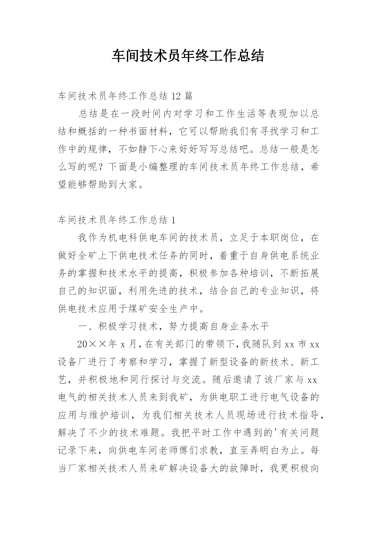车间技术员年终工作总结车间技术员年终工作总结12篇总结是在一段时间内对学习和工作生活等表现加以总结和概括的一种书面材料,它可以帮助我们有寻找学习和工作中的规律,不如静下心来好好写写总结吧。总结一般是怎么写的呢?下面是小编整理的车间技术员年终工作总结,希望能够帮助到大家。车间技术员年终工作总结1我作为机电科供电车间的技术员,立足于本职岗位,在做好全矿上下供电技术任务的同时,着重于自身供电系统业务的掌握和技术水平的提高,积极参加各种培训,不断拓展自己的知识面,利用先进的技术,结合自己的专业知识,将供电技术应用