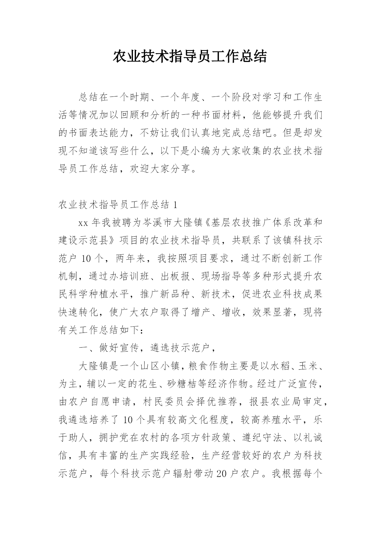 农业技术指导员工作总结总结在一个时期、一个年度、一个阶段对学习和工作生活等情况加以回顾和分析的一种书面材料,他能够提升我们的书面表达能力,不妨让我们认真地完成总结吧。但是却发现不知道该写些什么,以下是小编为大家收集的农业技术指导员工作总结,欢迎大家分享。农业技术指导员工作总结1xx年我被聘为岑溪市大隆镇《基层农技推广体系改革和建设示范县》项目的农业技术指导员,共联系了该镇科技示范户10个,两年来,我按照项目要求,通过不断创新工作机制,通过办培训班、出板报、现场指导等多种形式提升农民科学种植水平,推广新品种