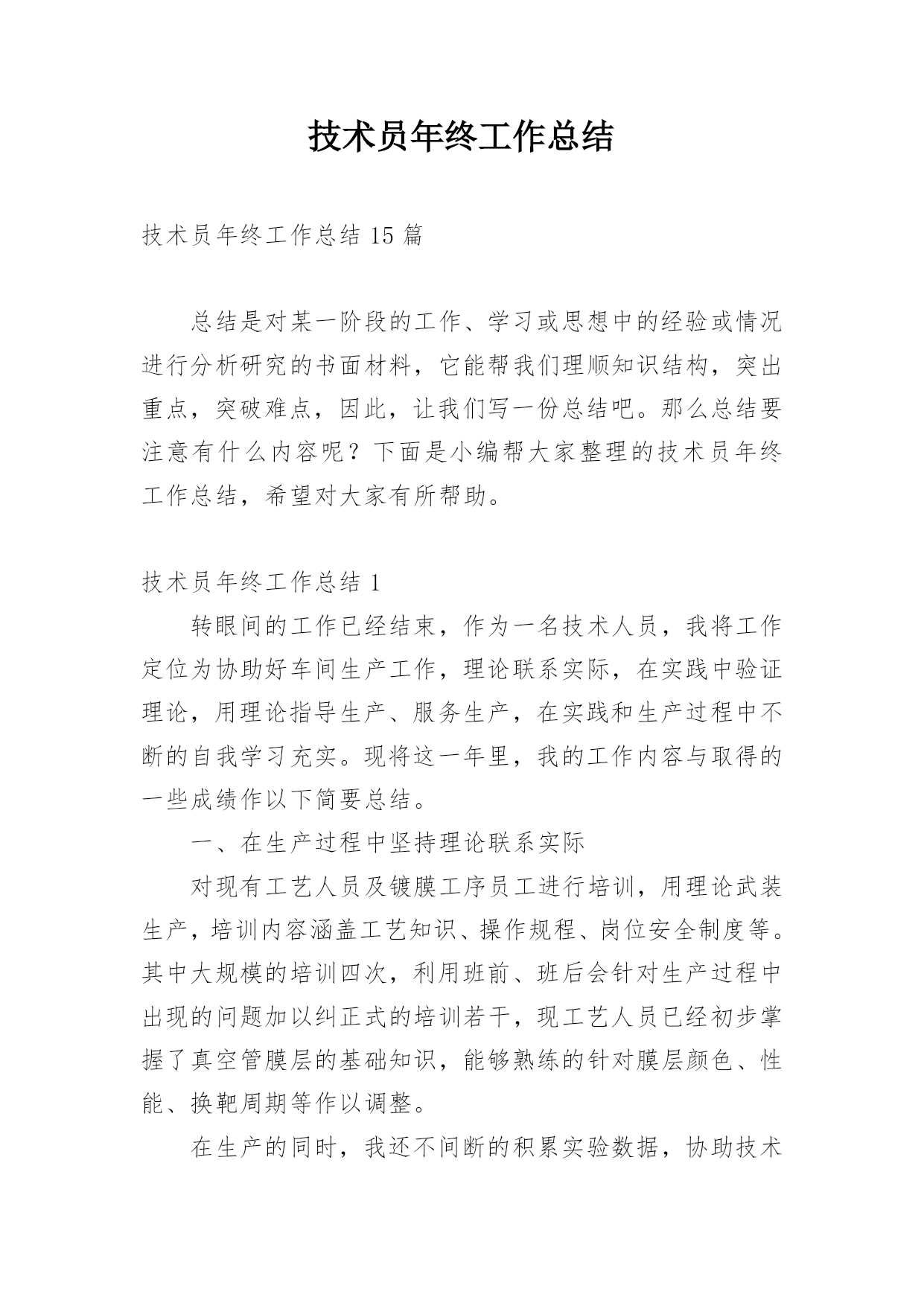 技术员年终工作总结技术员年终工作总结15篇总结是对某一阶段的工作、学习或思想中的经验或情况进行分析研究的书面材料,它能帮我们理顺知识结构,突出重点,突破难点,因此,让我们写一份总结吧。那么总结要注意有什么内容呢?下面是小编帮大家整理的技术员年终工作总结,希望对大家有所帮助。技术员年终工作总结1转眼间的工作已经结束,作为一名技术人员,我将工作定位为协助好车间生产工作,理论联系实际,在实践中验证理论,用理论指导生产、服务生产,在实践和生产过程中不断的自我学习充实。现将这一年里,我的工作内容与取得的一些成绩作以