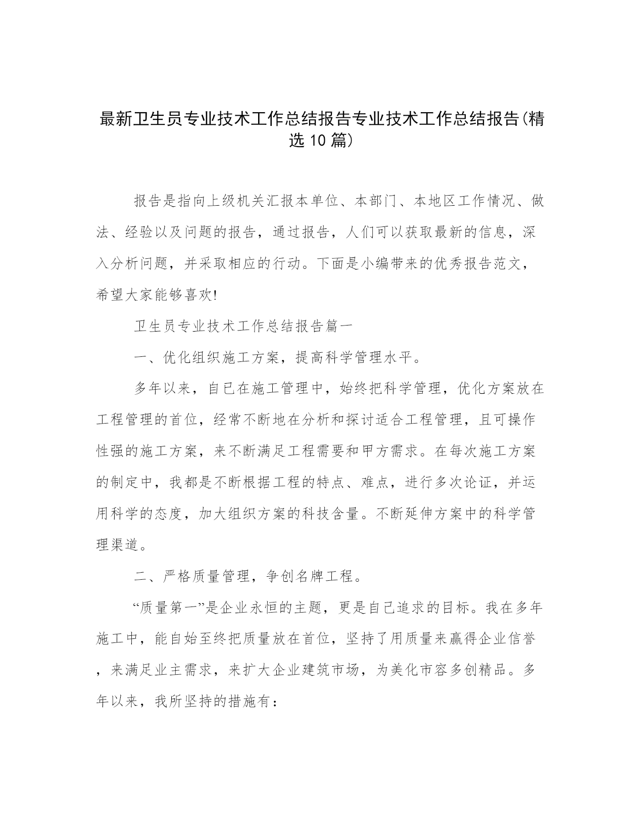 最新卫生员专业技术工作总结报告专业技术工作总结报告(精选10篇).docx