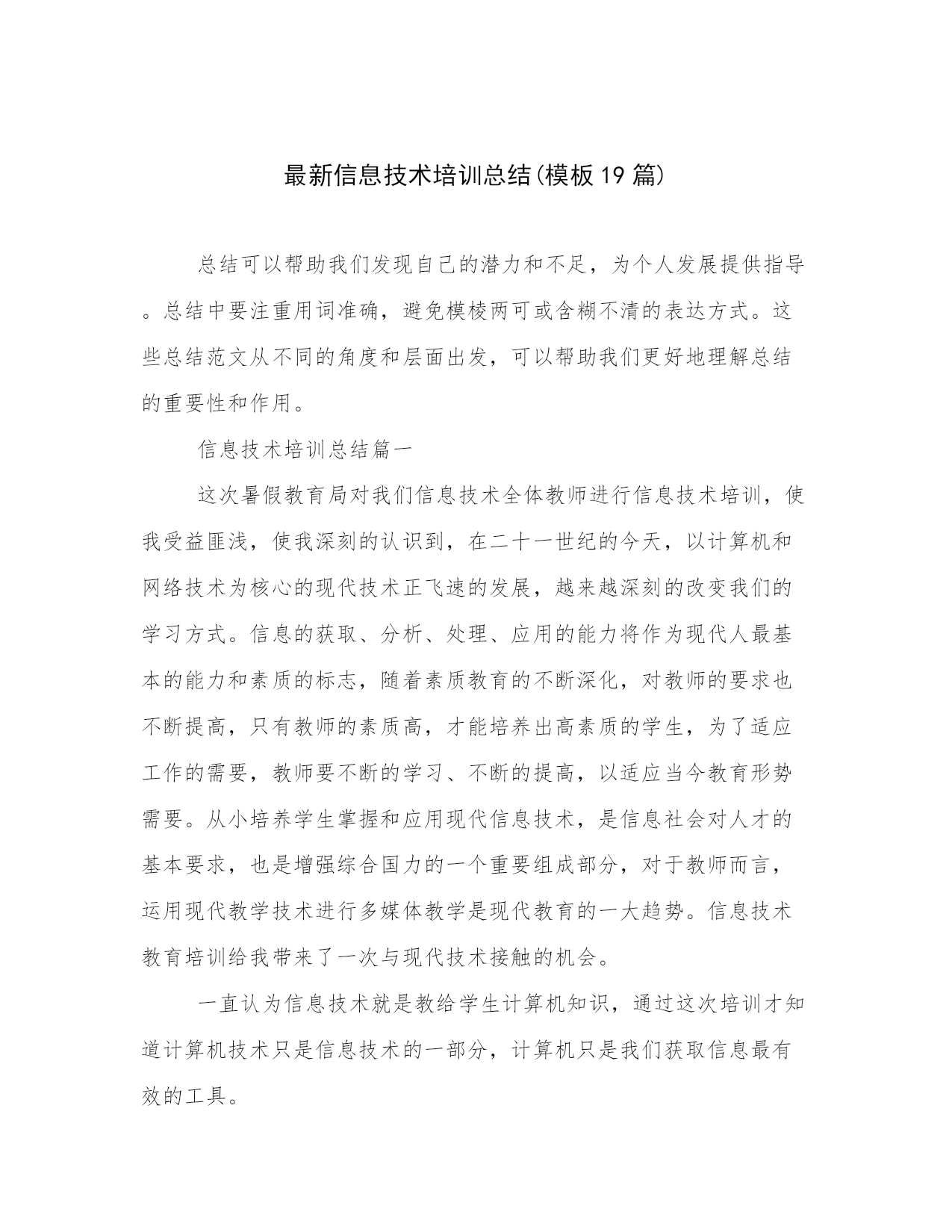 最新信息技术培训总结(模板19篇)总结可以帮助我们发现自己的潜力和不足,为个人发展提供指导。总结中要注重用词准确,避免模棱两可或含糊不清的表达方式。这些总结范文从不同的角度和层面出发,可以帮助我们更好地理解总结的重要性和作用。信息技术培训总结篇一这次暑假教育局对我们信息技术全体教师进行信息技术培训,使我受益匪浅,使我深刻的认识到,在二十一世纪的今天,以计算机和网络技术为核心的现代技术正飞速的发展,越来越深刻的改变我们的学习方式。信息的获取、分析、处理、应用的能力将作为现代人最基本的能力和素质的标志,随着素