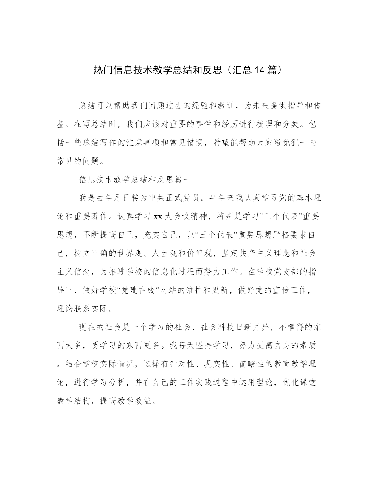 热门信息技术教学总结和反思(汇总14篇)总结可以帮助我们回顾过去的经验和教训,为未来提供指导和借鉴。在写总结时,我们应该对重要的事件和经历进行梳理和分类。包括一些总结写作的注意事项和常见错误,希望能帮助大家避免犯一些常见的问题。信息技术教学总结和反思篇一我是去年月日转为中共正式党员。半年来我认真学习党的基本理论和重要著作。认真学习xx大会议精神,特别是学习“三个代表”重要思想,不断提高自己,充实自己,以“三个代表”重要思想严格要求自己,树立正确的世界观、人生观和价值观,坚定共产主义理想和社会主义信念,为推
