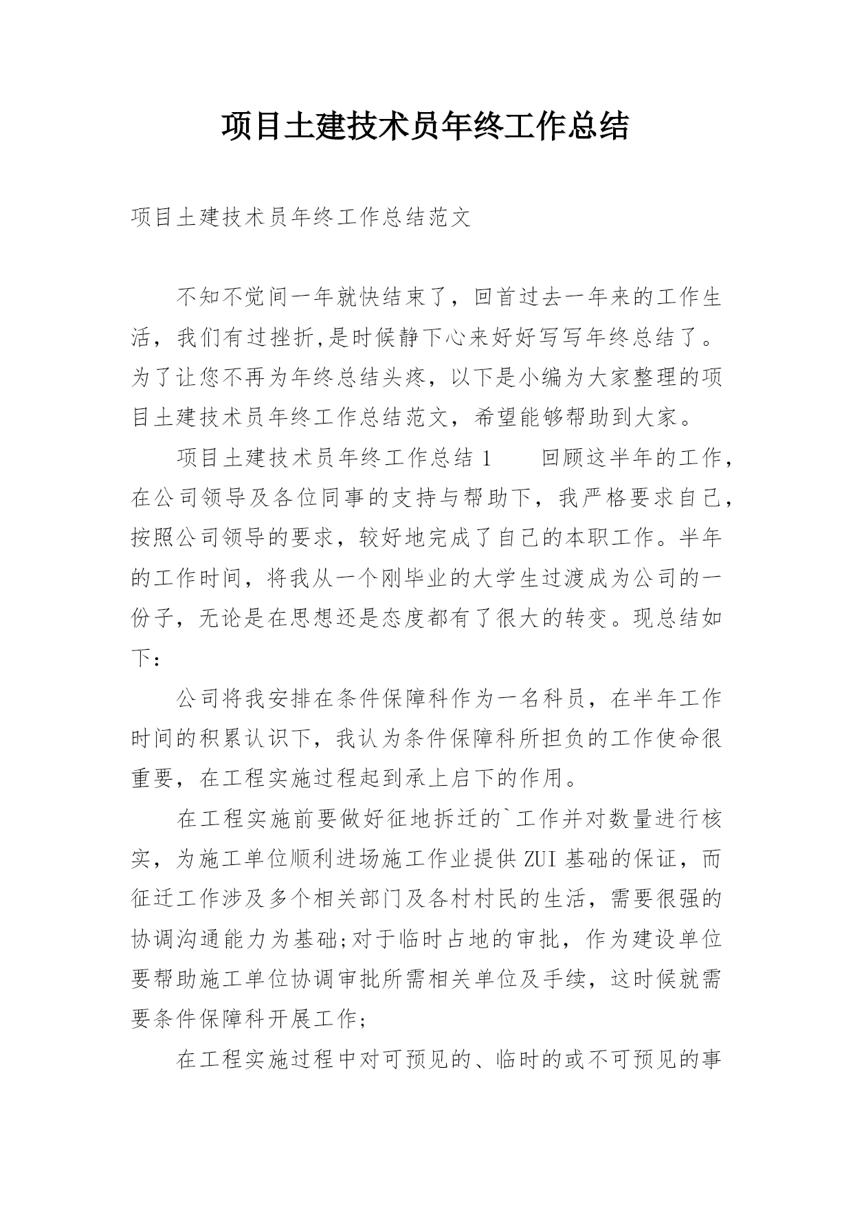 项目土建技术员年终工作总结项目土建技术员年终工作总结范文不知不觉间一年就快结束了,回首过去一年来的工作生活,我们有过挫折,是时候静下心来好好写写年终总结了。为了让您不再为年终总结头疼,以下是小编为大家整理的项目土建技术员年终工作总结范文,希望能够帮助到大家。项目土建技术员年终工作总结1回顾这半年的工作,在公司领导及各位同事的支持与帮助下,我严格要求自己,按照公司领导的要求,较好地完成了自己的本职工作。半年的工作时间,将我从一个刚毕业的大学生过渡成为公司的一份子,无论是在思想还是态度都有了很大的转变。现总结