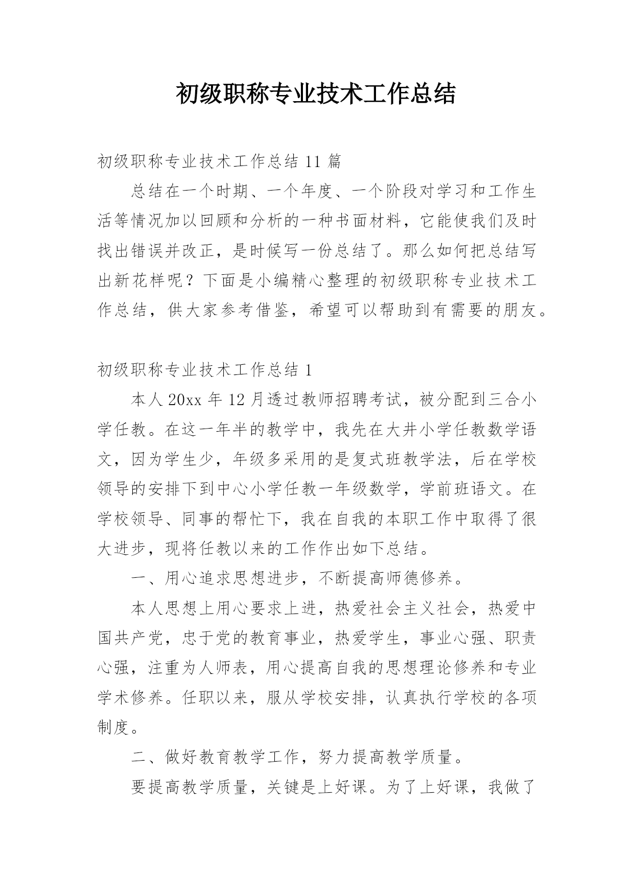 初级职称专业技术工作总结初级职称专业技术工作总结11篇总结在一个时期、一个年度、一个阶段对学习和工作生活等情况加以回顾和分析的一种书面材料,它能使我们及时找出错误并改正,是时候写一份总结了。那么如何把总结写出新花样呢?下面是小编精心整理的初级职称专业技术工作总结,供大家参考借鉴,希望可以帮助到有需要的朋友。初级职称专业技术工作总结1本人20xx年12月透过教师招聘考试,被分配到三合小学任教。在这一年半的教学中,我先在大井小学任教数学语文,因为学生少,年级多采用的是复式班教学法,后在学校领导的安排下到中心小