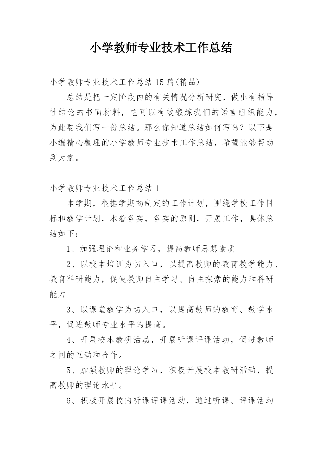 小学教师专业技术工作总结小学教师专业技术工作总结15篇(精品)总结是把一定阶段内的有关情况分析研究,做出有指导性结论的书面材料,它可以有效锻炼我们的语言组织能力,为此要我们写一份总结。那么你知道总结如何写吗?以下是小编精心整理的小学教师专业技术工作总结,希望能够帮助到大家。小学教师专业技术工作总结1本学期,根据学期初制定的工作计划,围绕学校工作目标和教学计划,本着务实,务实的原则,开展工作,具体总结如下:1、加强理论和业务学习,提高教师思想素质2、以校本培训为切入口,以提高教师的教育教学能力、教育科研能力
