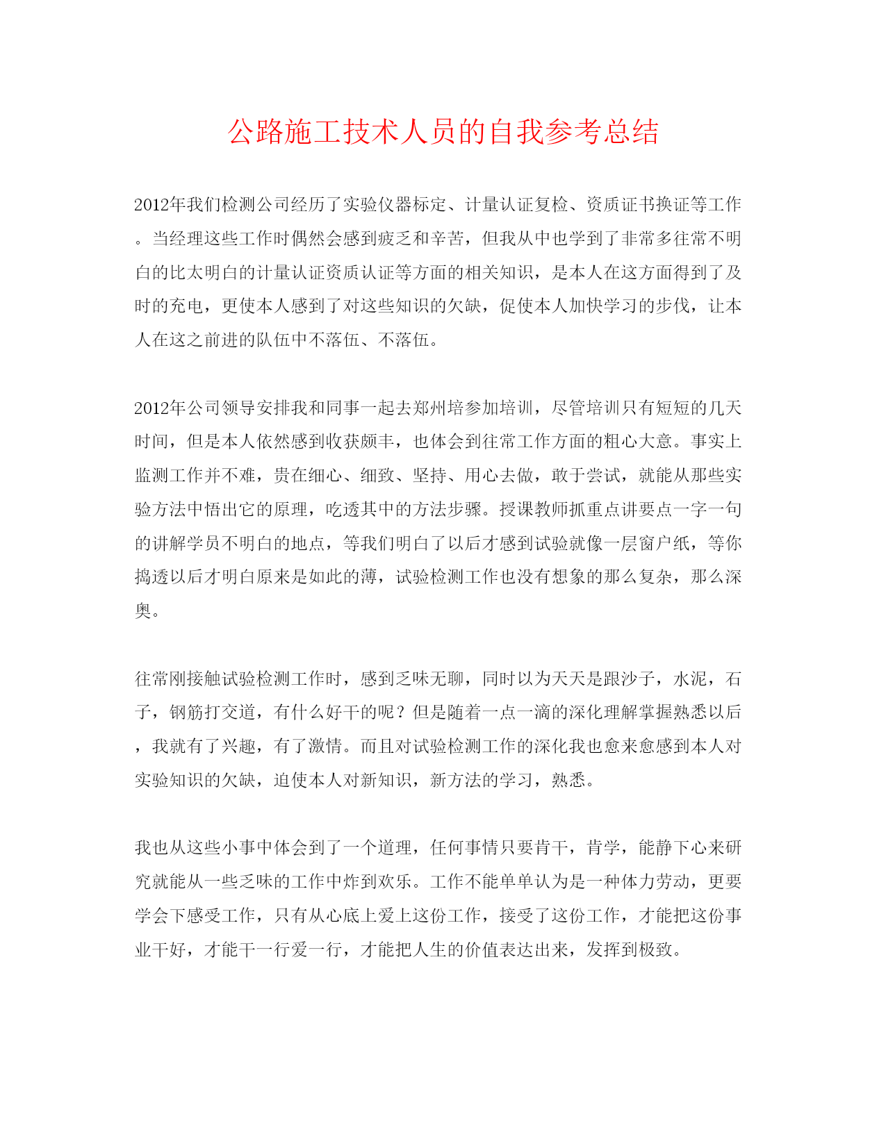 公路施工技术人员的自我参考总结2012年我们检测公司经历了实验仪器标定、计量认证复检、资质证书换证等工作。当经理这些工作时偶然会感到疲乏和辛苦,但我从中也学到了非常多往常不明白的比太明白的计量认证资质认证等方面的相关知识,是本人在这方面得到了及时的充电,更使本人感到了对这些知识的欠缺,促使本人加快学习的步伐,让本人在这之前进的队伍中不落伍、不落伍。2012年公司领导安排我和同事一起去郑州培参加培训,尽管培训只有短短的几天时间,但是本人依然感到收获颇丰,也体会到往常工作方面的粗心大意。事实上监测工作并不难,