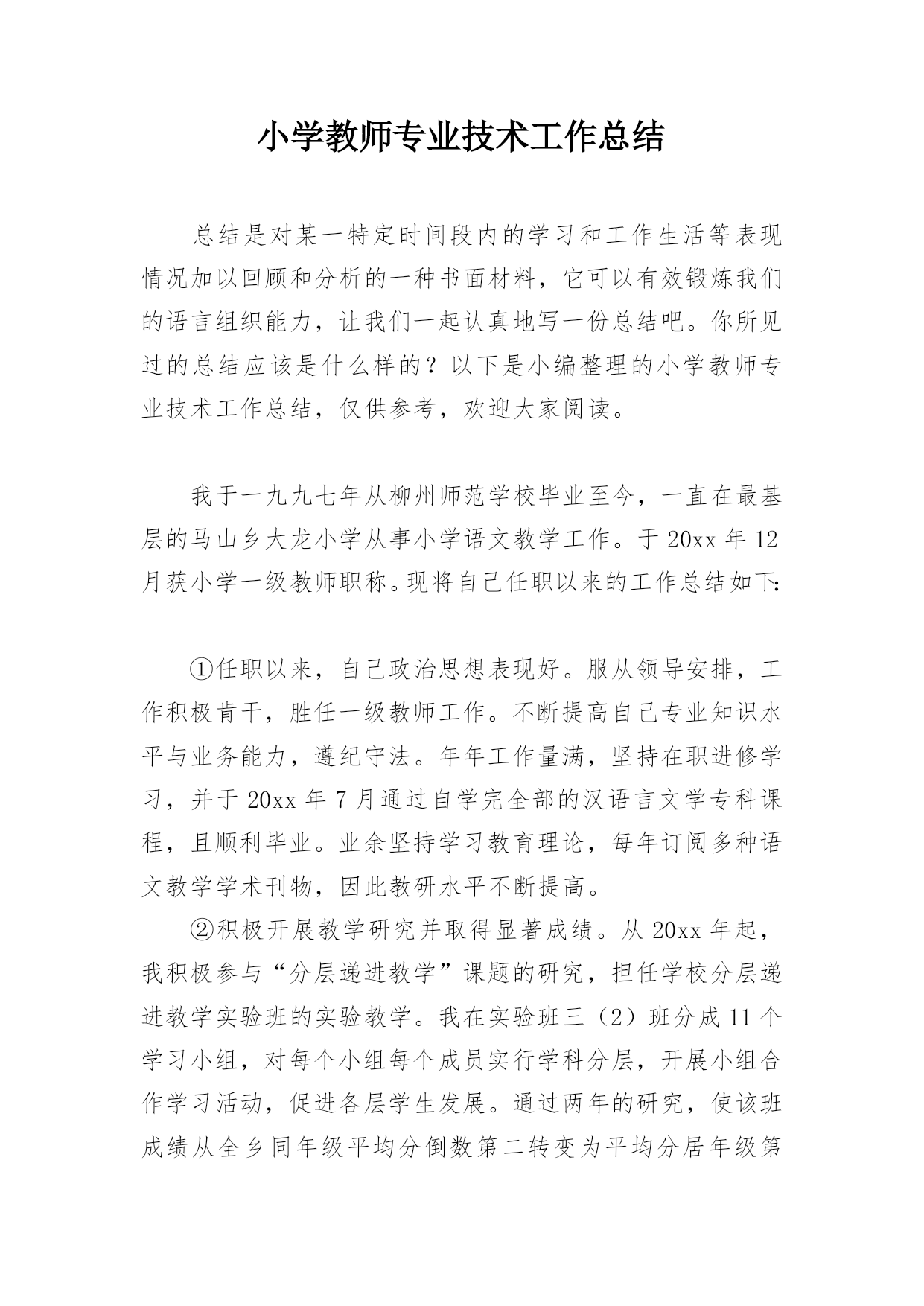 小学教师专业技术工作总结总结是对某一特定时间段内的学习和工作生活等表现情况加以回顾和分析的一种书面材料,它可以有效锻炼我们的语言组织能力,让我们一起认真地写一份总结吧。你所见过的总结应该是什么样的?以下是小编整理的小学教师专业技术工作总结,仅供参考,欢迎大家阅读。我于一九九七年从柳州师范学校毕业至今,一直在最基层的马山乡大龙小学从事小学语文教学工作。于20xx年12月获小学一级教师职称。现将自己任职以来的工作总结如下:①任职以来,自己政治思想表现好。服从领导安排,工作积极肯干,胜任一级教师工作。不断提高自