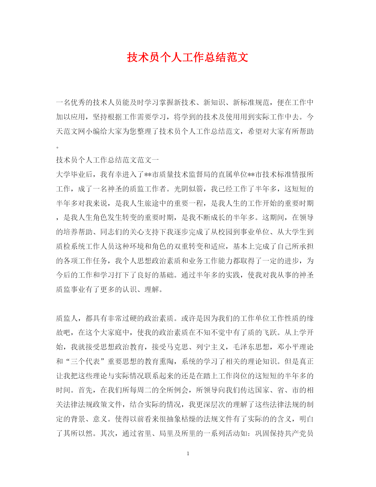 此资料由网络收集而来,如有侵权请告知上传者立即删除。资料共分享,我们负责传递知识。PAGEPAGE8技术员个人工作总结范文一名优秀的技术人员能及时学习掌握新技术、新知识、新标准规范,便在工作中加以应用,坚持根据工作需要学习,将学到的技术及使用用到实际工作中去。今天范文网小编给大家为您整理了技术员个人工作总结范文,希望对大家有所帮助。技术员个人工作总结范文范文一大学毕业后,我有幸进入了**市质量技术监督局的直属单位**市技术标准情报所工作,成了一名神圣的质监工作者。光阴似箭,我已经工作了半年多,