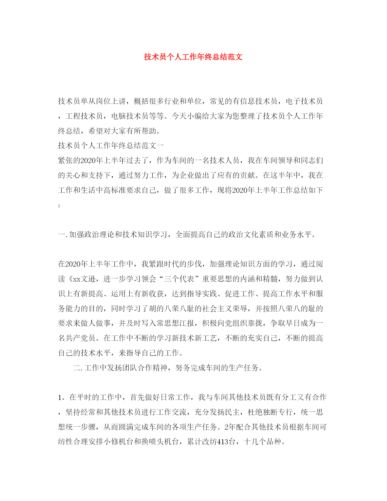此资料由网络收集而来,如有侵权请告知上传者立即删除。资料共分享,我们负责传递知识。技术员个人工作年终总结范文技术员单从岗位上讲,概括很多行业和单位,常见的有信息技术员,电子技术员,工程技术员,电脑技术员等等。今天小编给大家为您整理了技术员个人工作年终总结,希望对大家有所帮助。技术员个人工作年终总结范文一紧张的2020年上半年过去了,作为车间的一名技术人员,我在车间领导和同志们的关心和支持下,通过努力工作,为企业做出了应有的贡献。在这半年中,我在工作和生活中高标准要求自己,做了很多工作,现将2020年上半年